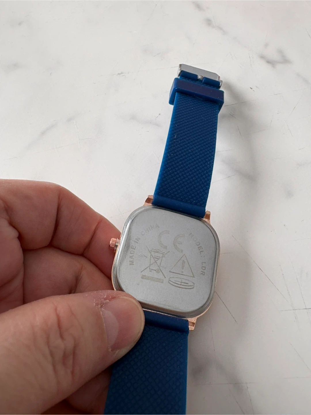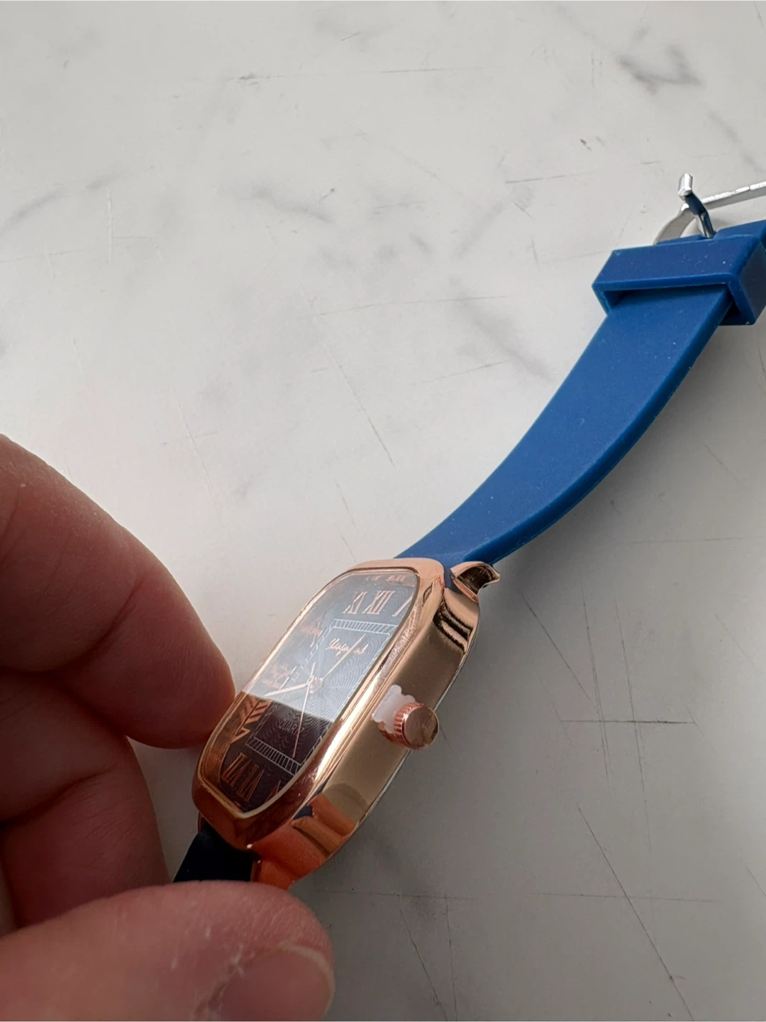 Elegant and modern women’s wristwatch featuring a navy blue silicone strap and rose gold square case. Designed with Roman numeral dial and quartz movement. Perfect for both everyday wear and classic outfits.