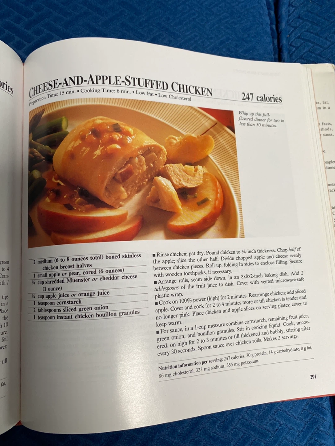 This cookbook offers low-calorie home cooking recipes. It features sections on main dishes, salads, side dishes, and desserts. Includes recipes like 'Cheese-and-Apple-Stuffed Chicken' and 'Marinated Turkey Slices'. Great for anyone looking for healthier meal options!