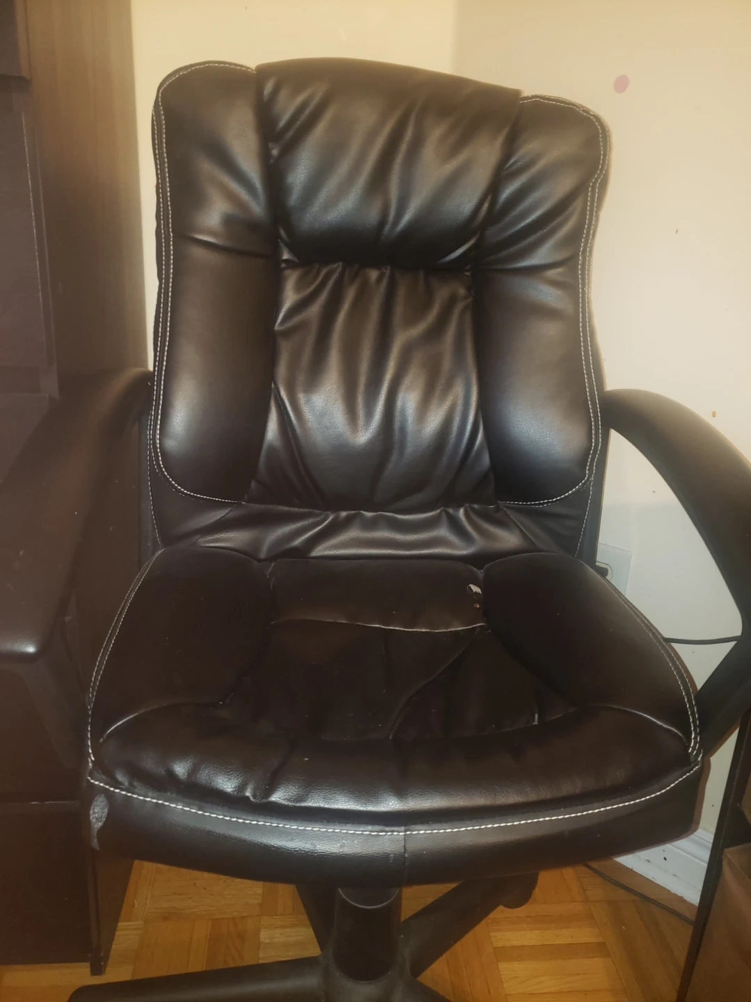 Good condition. Super comfy . It features a padded seat and back with white stitching detail. The chair is height-adjustable and has a swivel base with casters and can easily lounge in it .