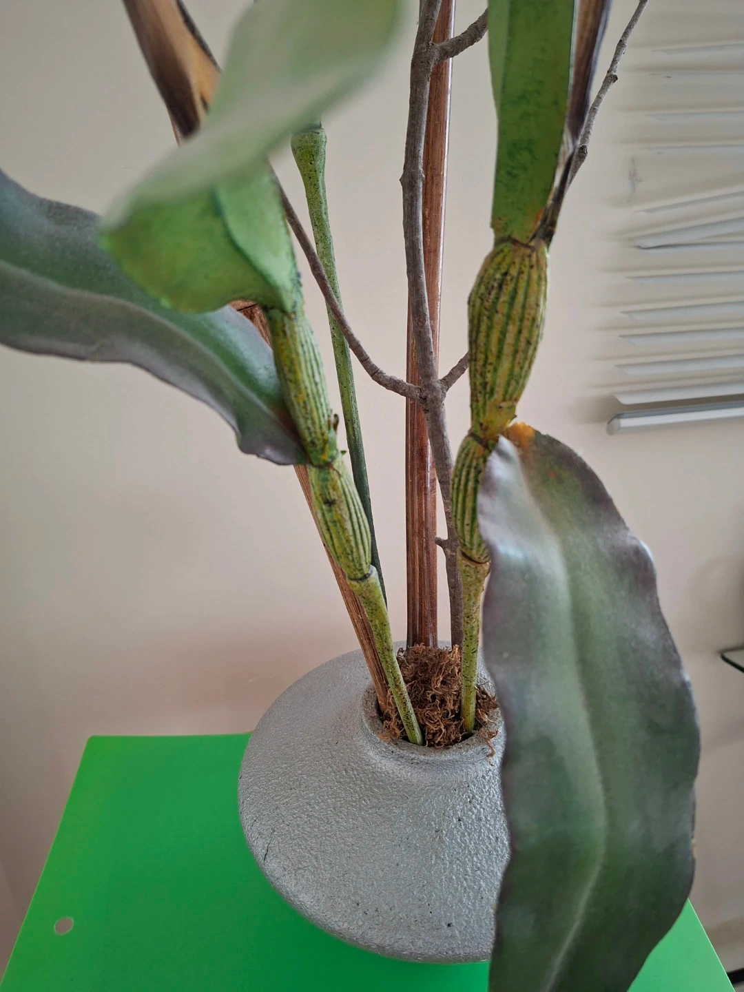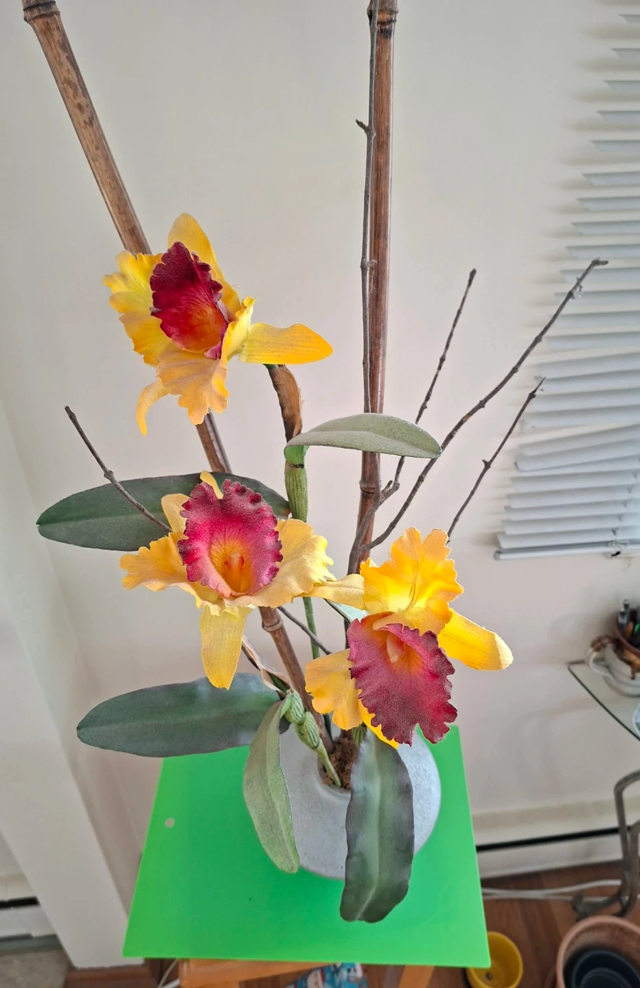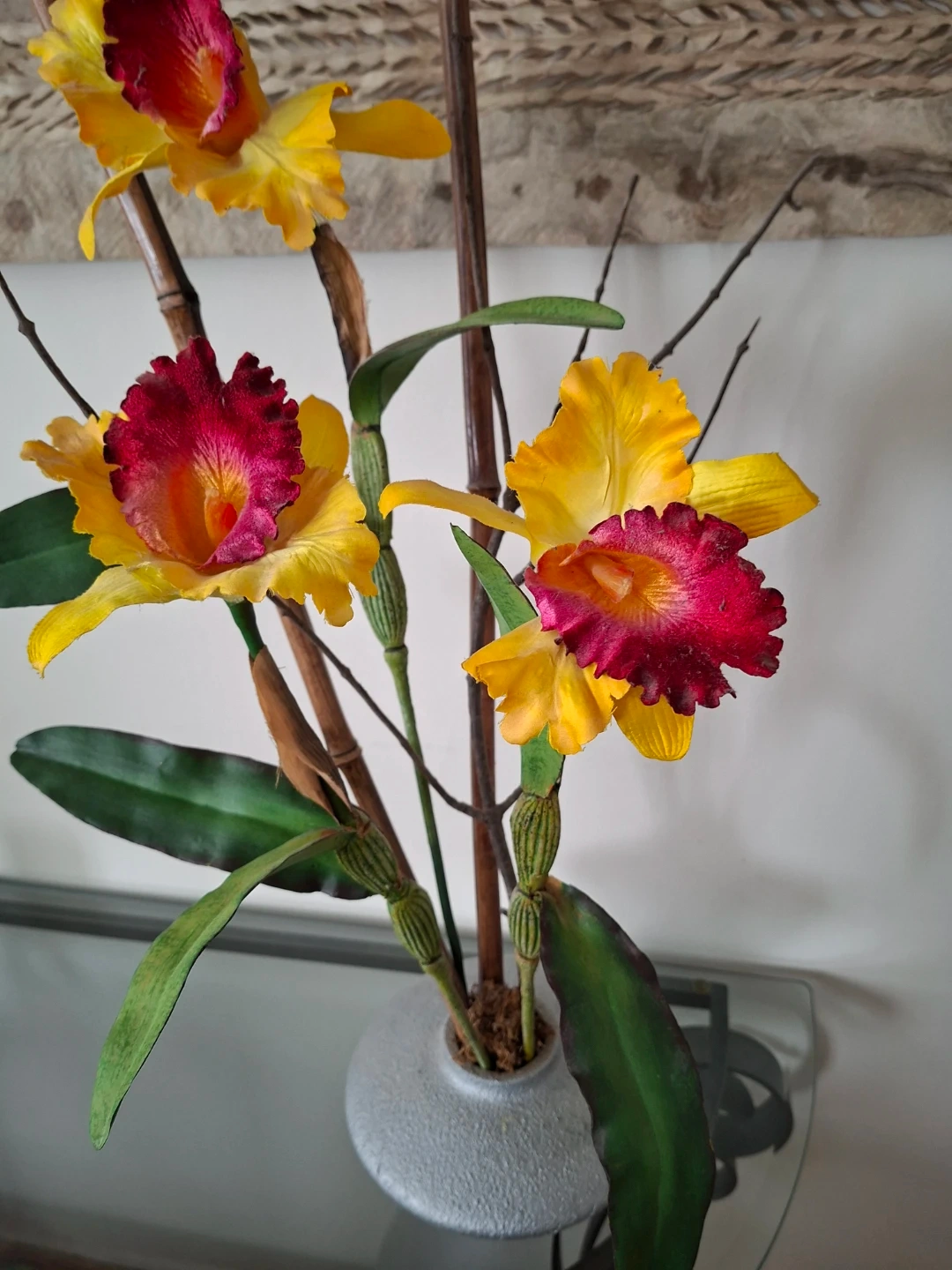 Beautiful silk orchid arrangement with yellow and red blooms. Comes in a grey textured vase with bamboo stems and green leaves. Adds a touch of elegance to any room!