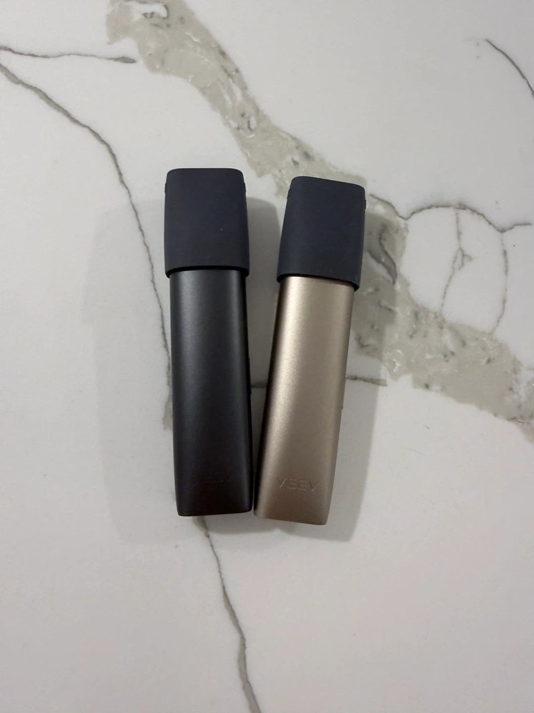 Two VEEV devices are included, one in black and one in gold. They have a sleek, modern design. This is a great option for those looking for a reliable vaping device.