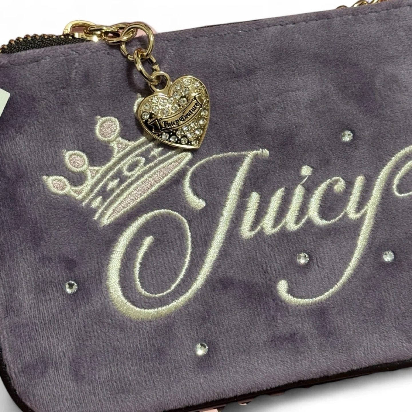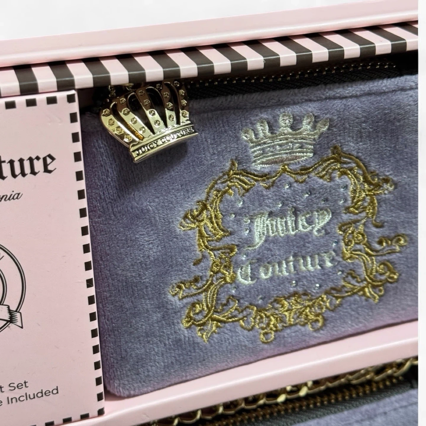 Selling a brand new Juicy Couture 2-piece wristlet set! It comes in its original box and includes a coin purse. This limited edition set is perfect for adding a touch of sparkle to your accessories collection. The wristlets are a beautiful purple colour with the iconic Juicy Couture logo and crown detailing
