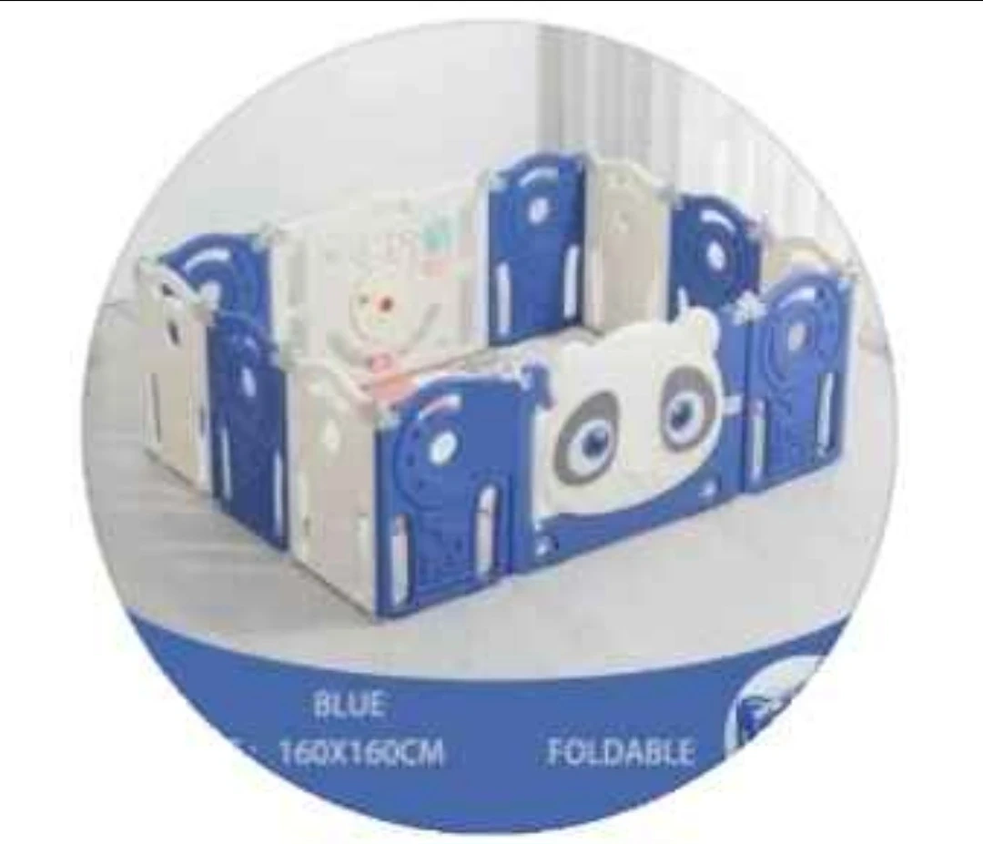 Selling a blue and white foldable playpen. It measures 160x160cm, perfect for keeping your little one safe and entertained!