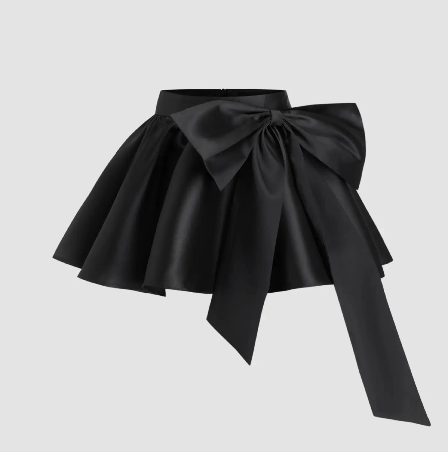 Women's skirt. Black satin fabric. Features a large, dramatic bow at the waist. A-line silhouette. Stylish and elegant.