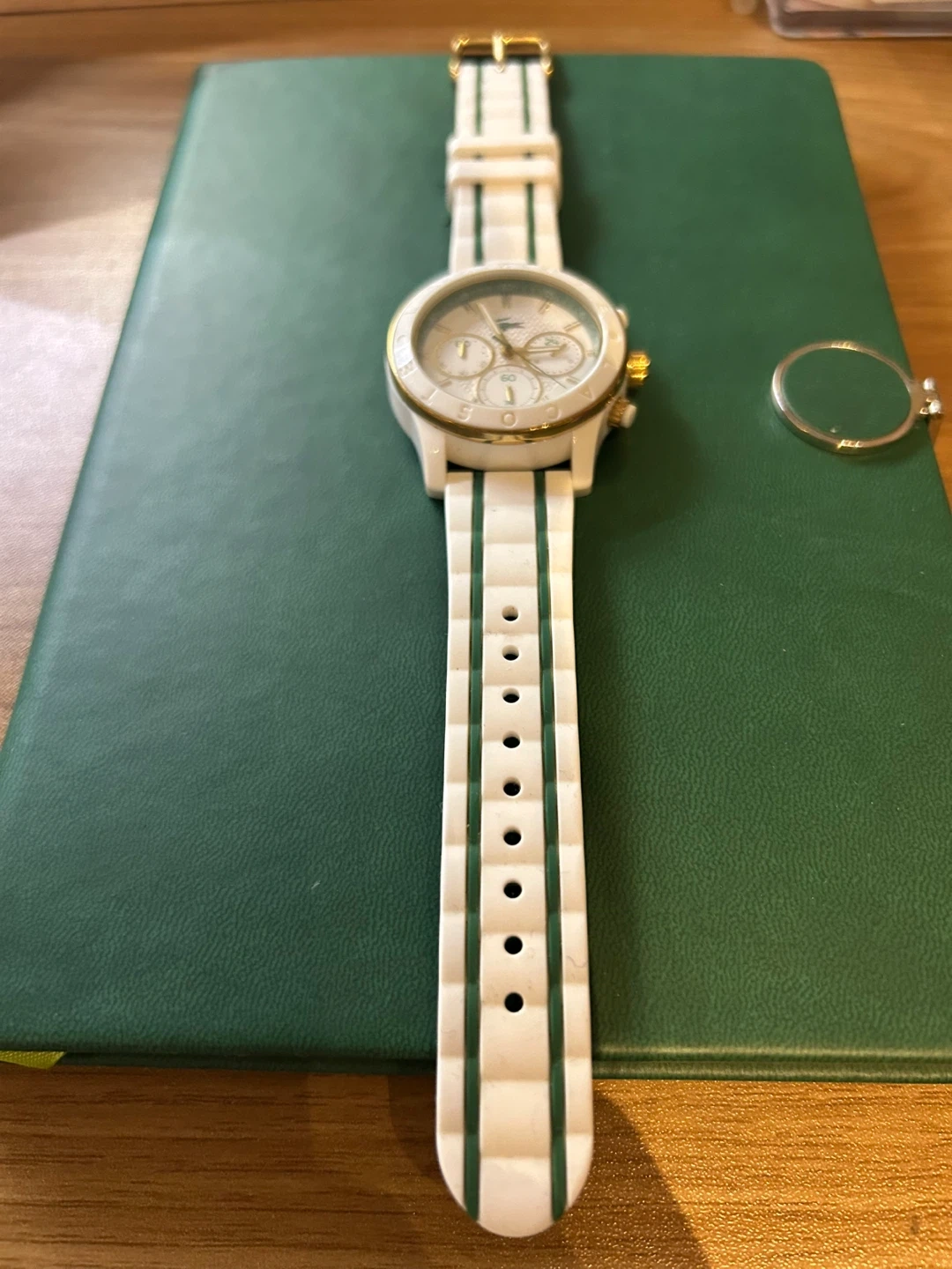 Selling a stylish Lacoste sporty watch in white,green and gold. It has been well maintained and only few time used, so it looks still pretty new. The watch features a chronograph dial and a comfortable silicone strap.