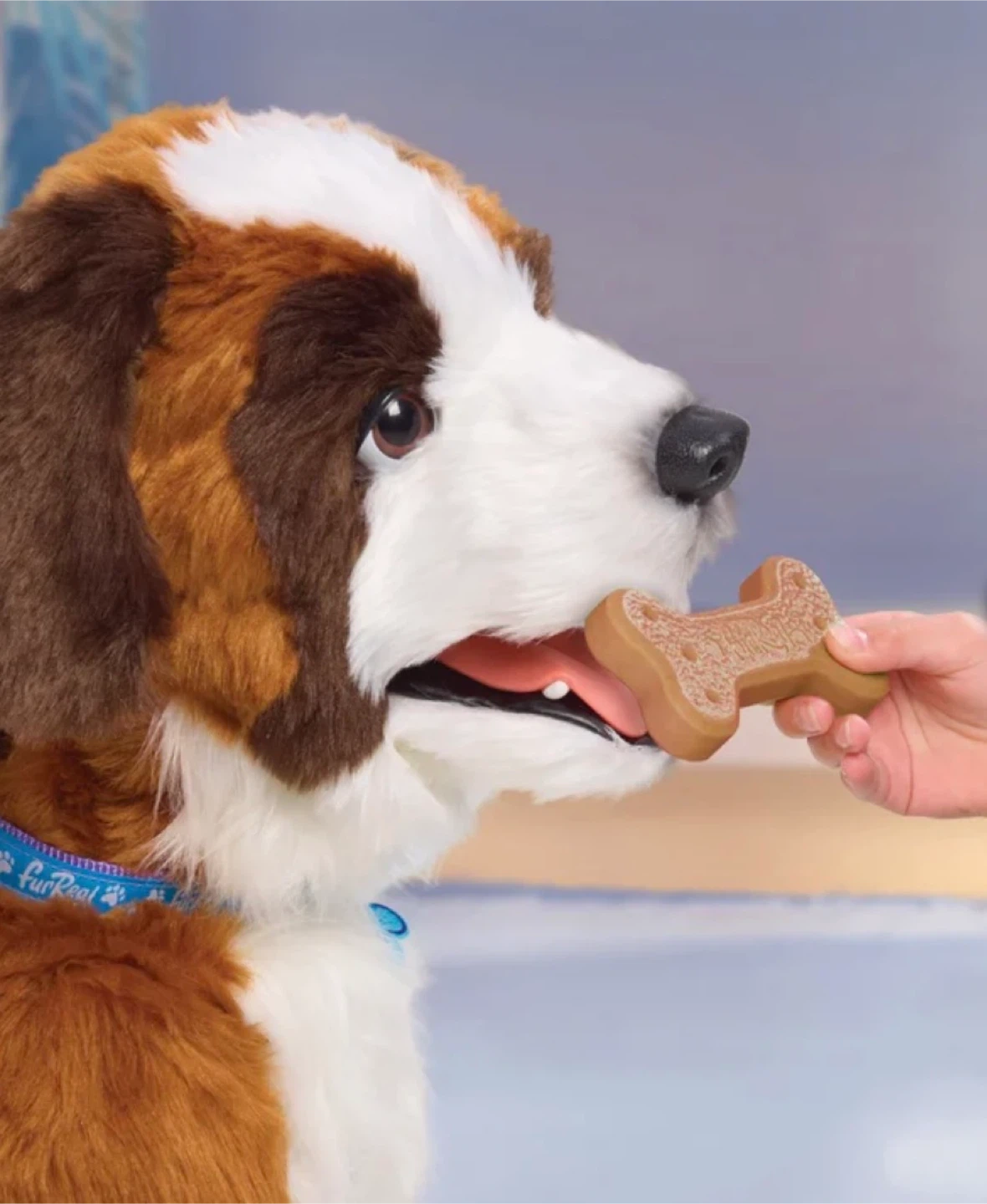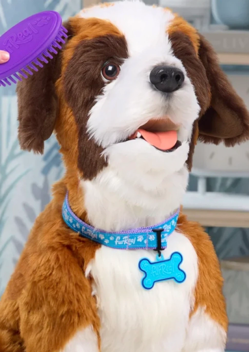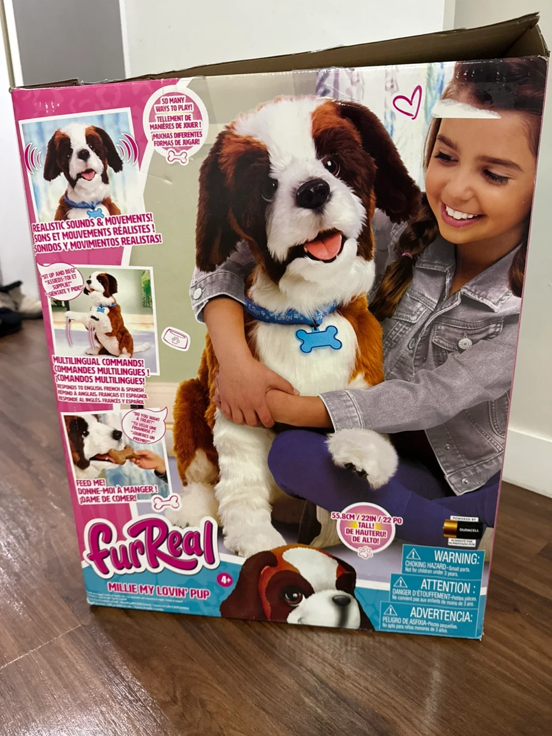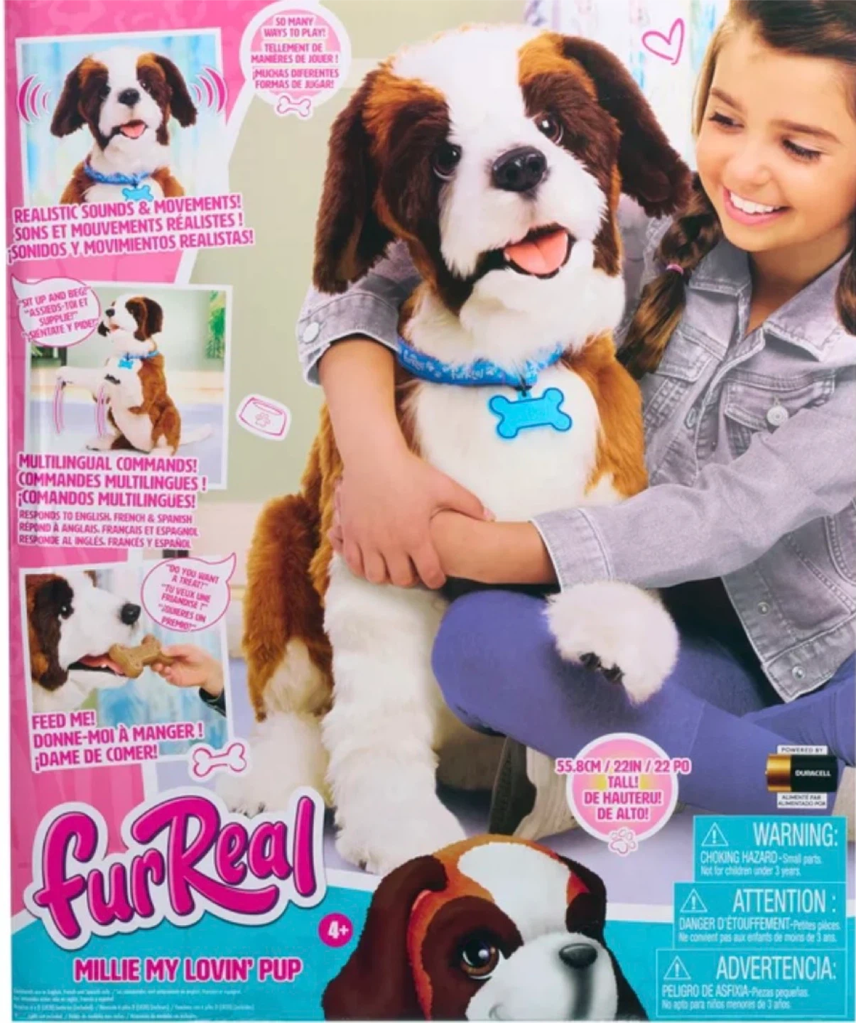 This FurReal Millie My Lovin' Pup responds to sounds and movements with realistic expressions and vocalizations. It's approximately 22 inches tall and can interact in English, French, and Spanish. Feed it a treat and pet its head for a sweet response!