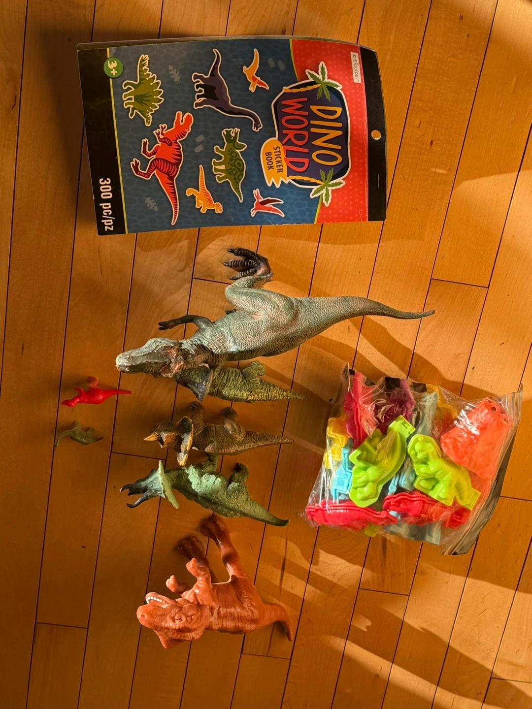 This set includes a "Dino World" sticker book with 300 pieces and a collection of toy dinosaurs. The sticker book is recommended for ages 3+. Perfect for young dinosaur enthusiasts to create their own prehistoric scenes!