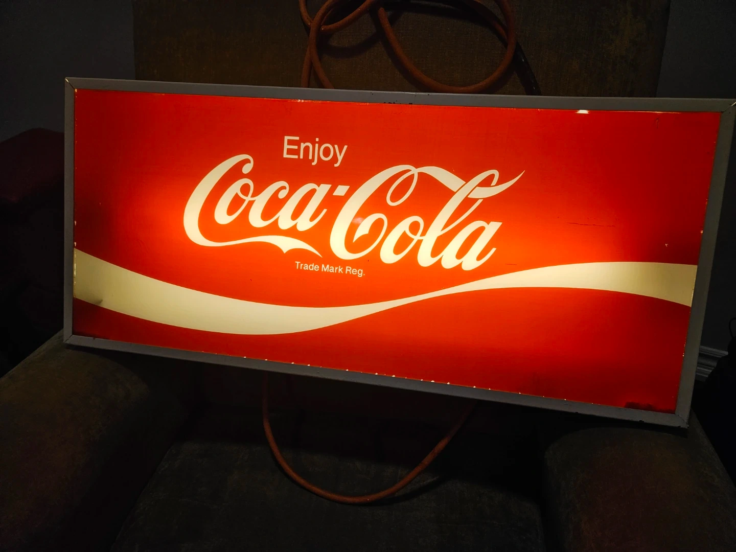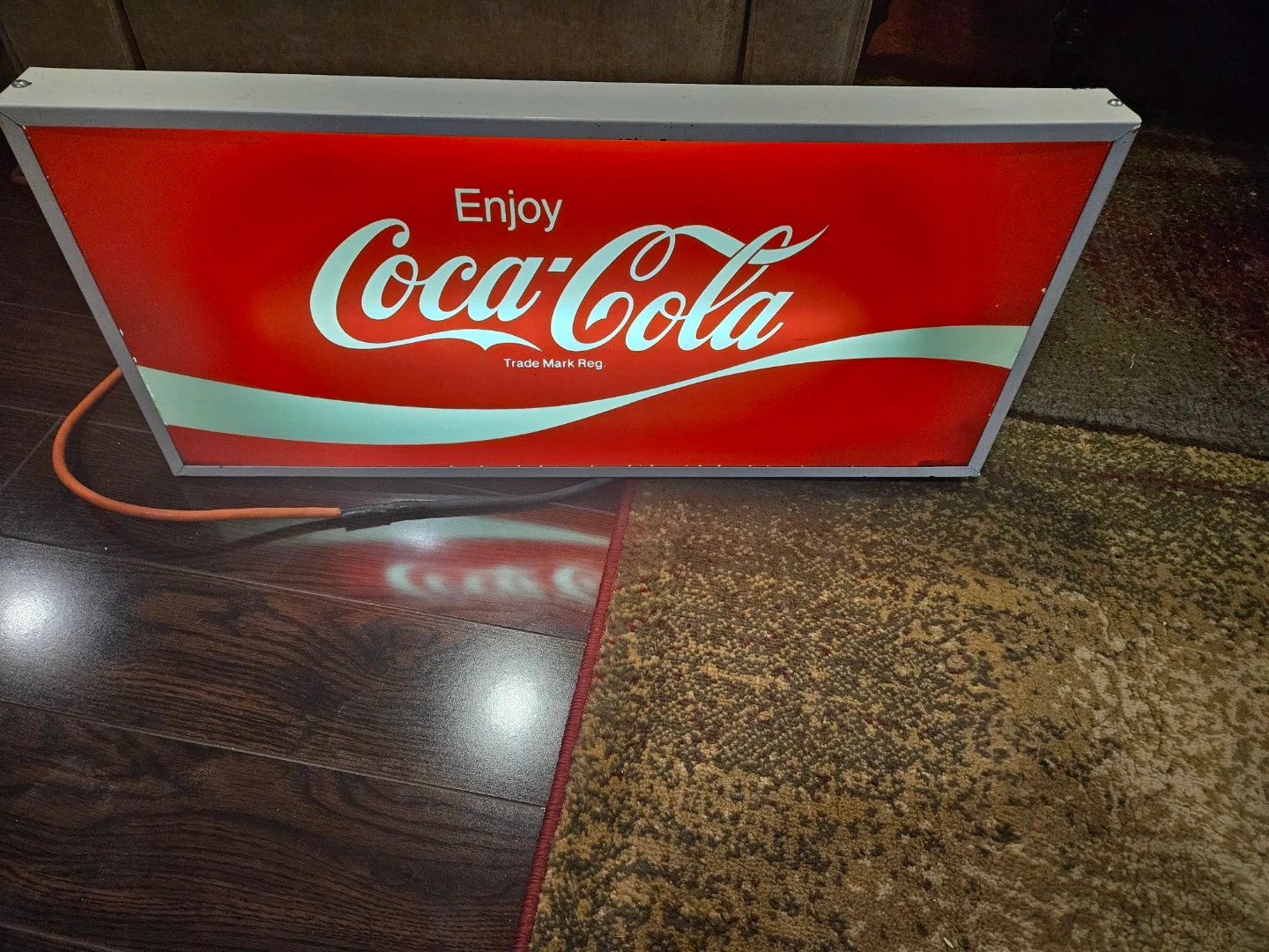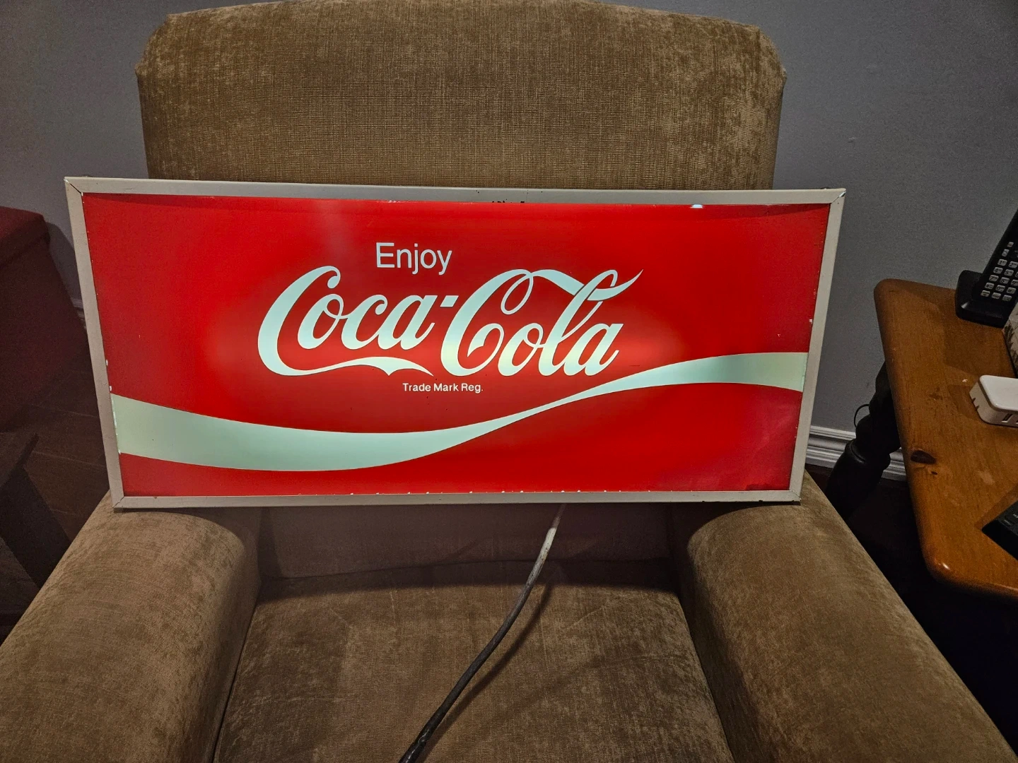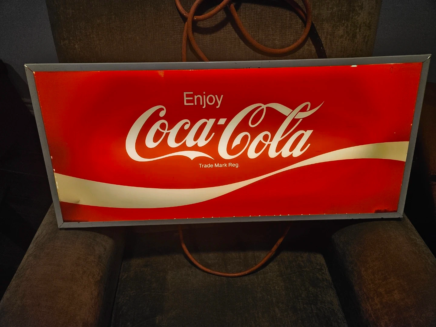 Classic Coca-Cola sign with the iconic script logo. It's a great piece for any collector or fan of vintage memorabilia. This sign would look awesome in a rec room or garage!