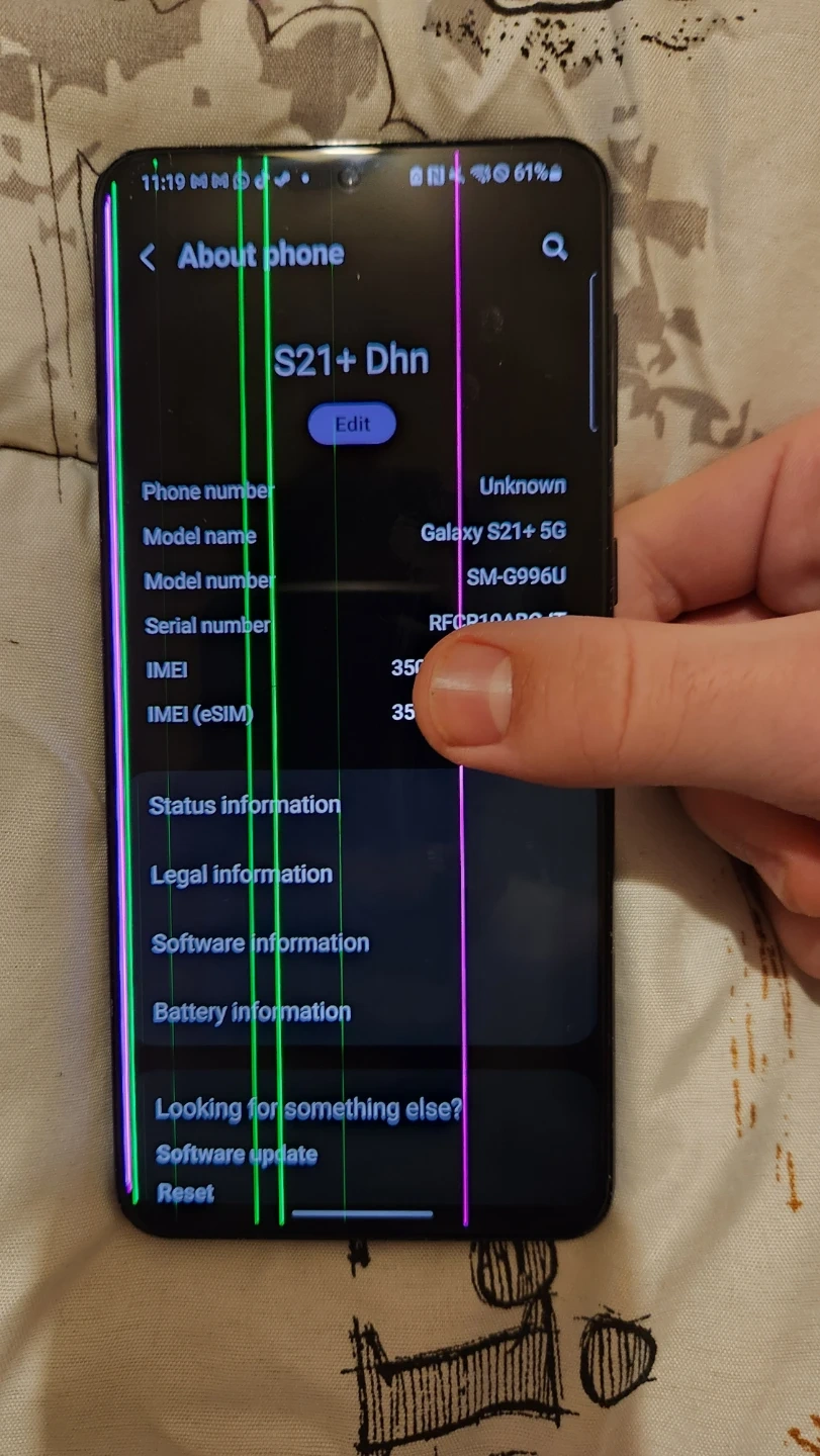 Samsung Galaxy S21+ 5G smartphone. It's black and has 128GB of storage. The screen displays vertical lines. The screen is In good condition except the Lines, everything works fine maybe if you want it for parts.