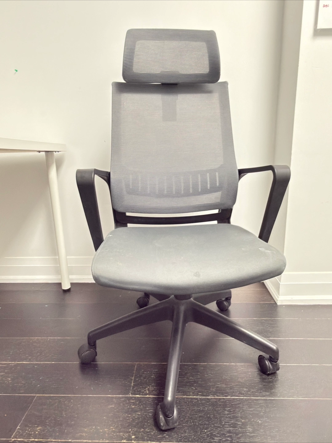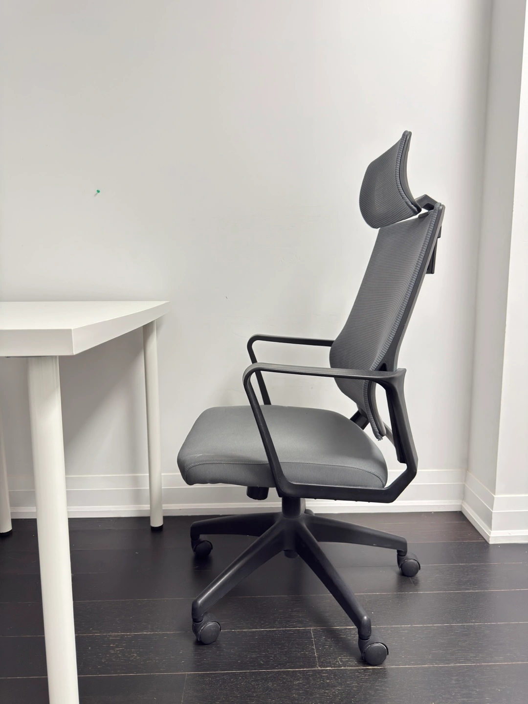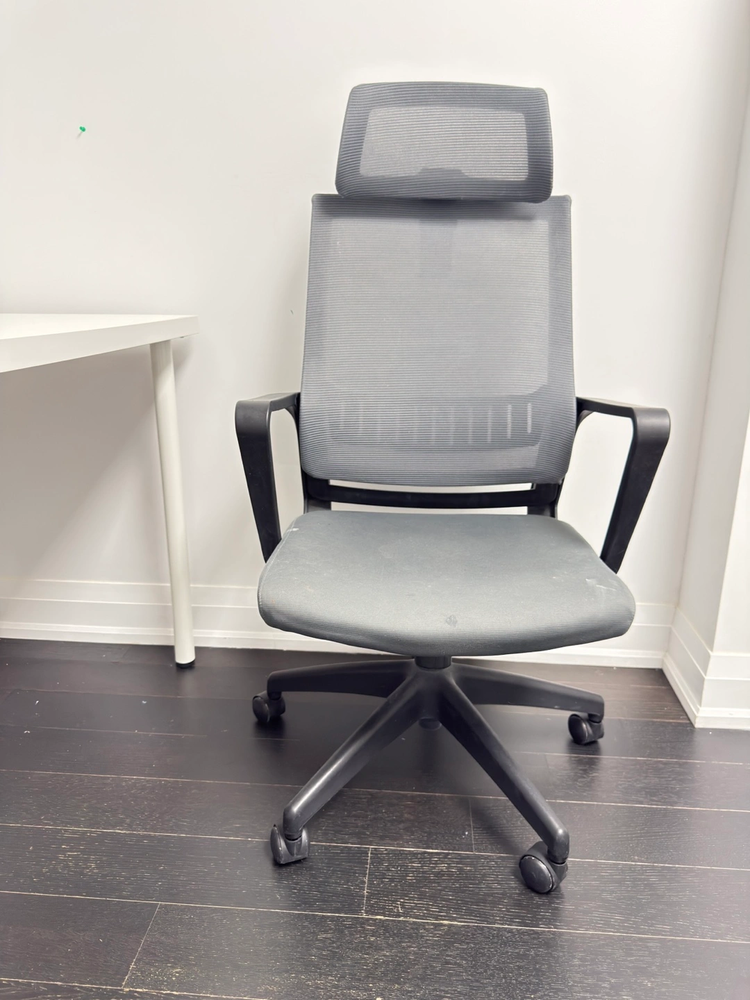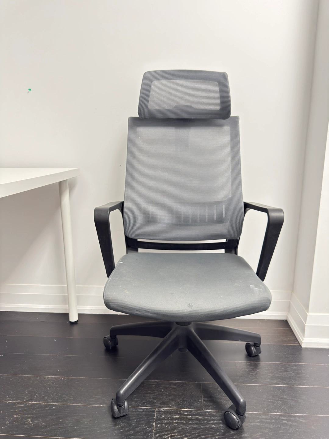 This is a grey mesh office chair with a headrest. It features a durable mesh back and seat for breathability. The chair's base has wheels for easy mobility. It's suitable for a home office setup.