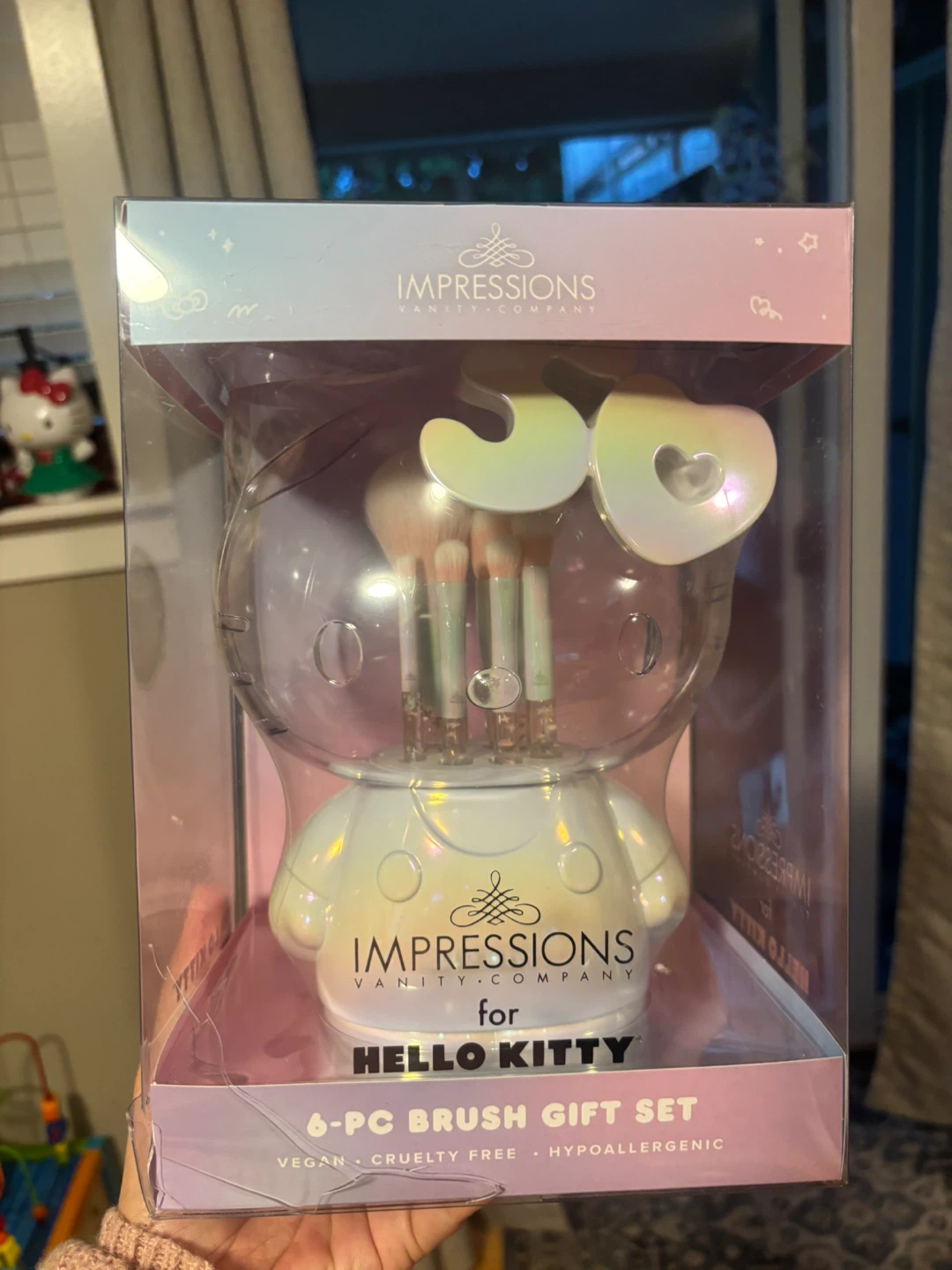 This Impressions Vanity 6-piece brush gift set features a Hello Kitty design. The brushes are vegan, cruelty-free, and hypoallergenic. It's a cute set for makeup lovers! Open to offers 65 50 or something
