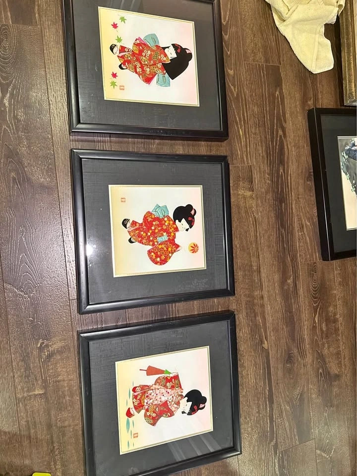 Beautiful coordinated set of three Japanese art prints featuring girls in traditional kimonos with soft pastel backgrounds and red hanko signature stamps. Each piece is framed in matching black frames and looks stunning displayed together. Perfect for a bedroom, hallway, nursery, living room, or anyone who loves Japanese culture and minimalist décor. Set of 3 matching pieces. Frame Size: 17” × 16” each. Great overall vintage condition; ready to hang. Style: Kimono girls / traditional Japanese illustration. Selling as a full set only.