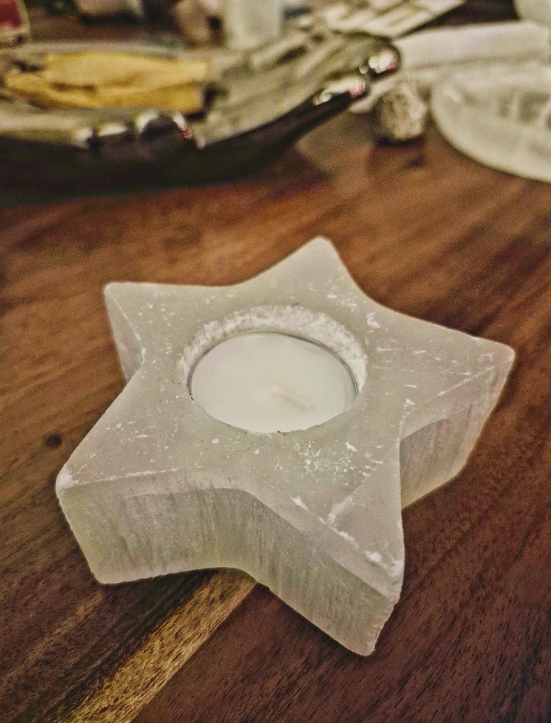 This star-shaped tealight candle holder is made from a light-coloured stone selenite. It's perfect for adding a cozy ambiance to any room.