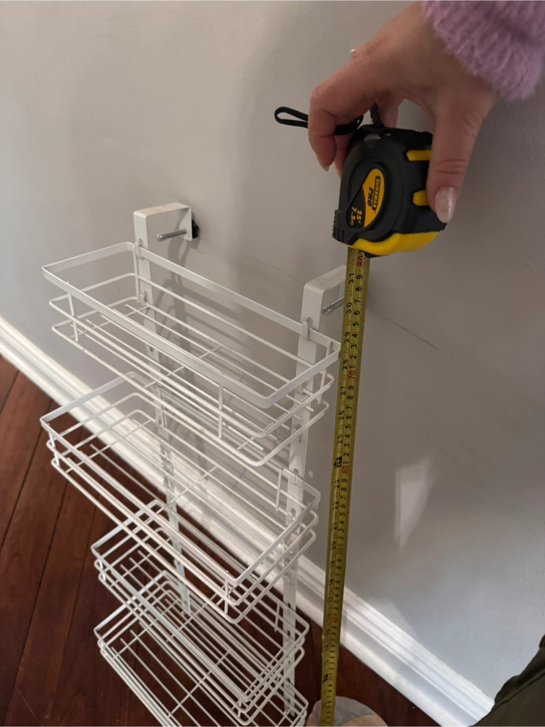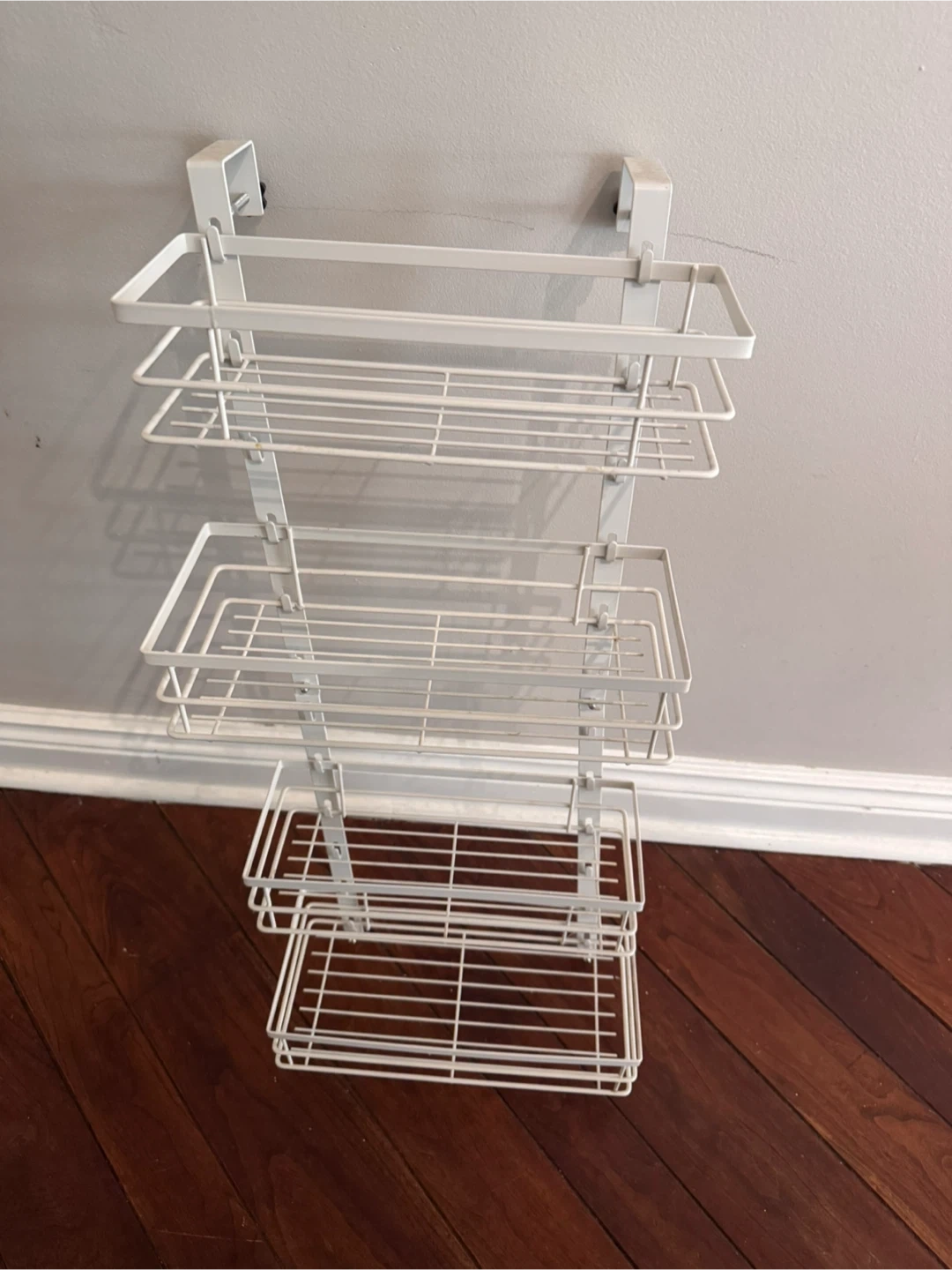 Over the door storage rack with four wide shelves.