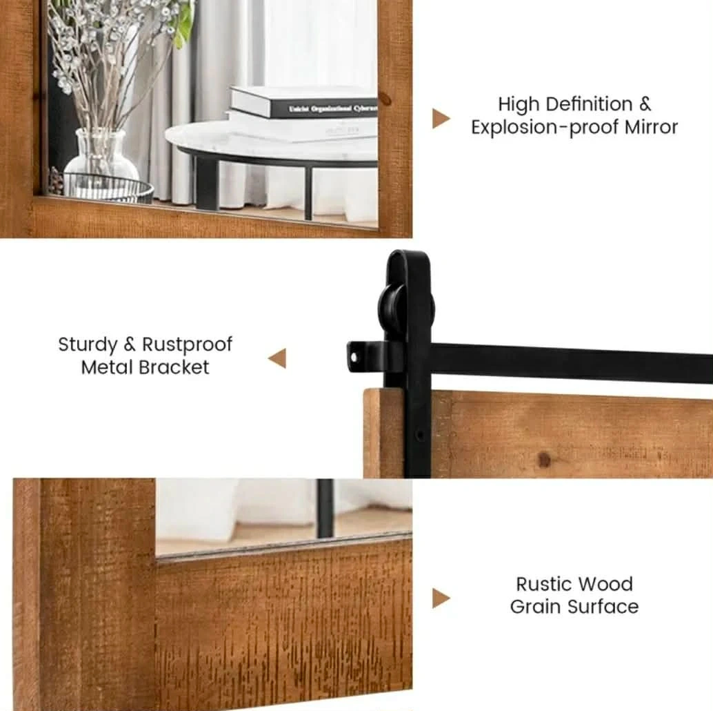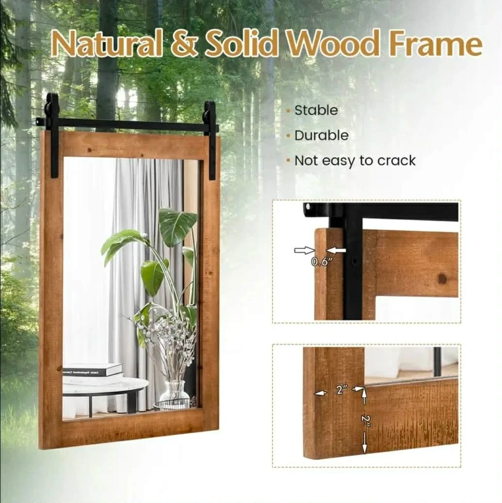 This farmhouse decorative wall mirror features a rustic solid wood frame with a sliding barn door hardware accent. It's a high definition, explosion-proof mirror that brightens up your living space. The overall dimensions are 30" H x 22" W.