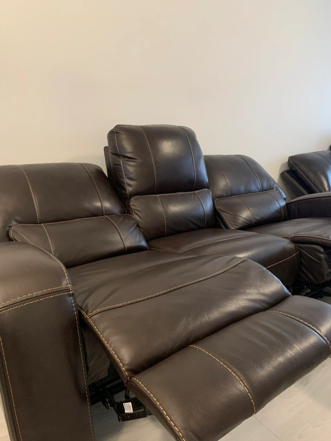 This is a comfortable brown leather power reclining sofa. It features a smooth reclining mechanism controlled by buttons on the side. The stitching is a nice contrast detail. It's a great addition for any living room! Just one piece.