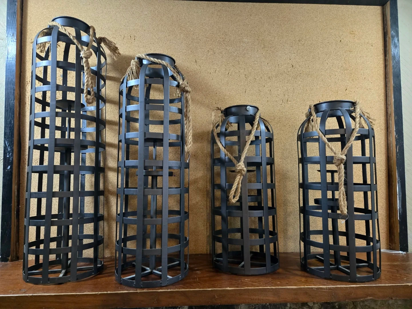 Set of four large black metal lanterns with a caged design and rope accents. These lanterns have a rustic, industrial look. They're perfect for adding ambiance to any outdoor or indoor space. Heavy duty.