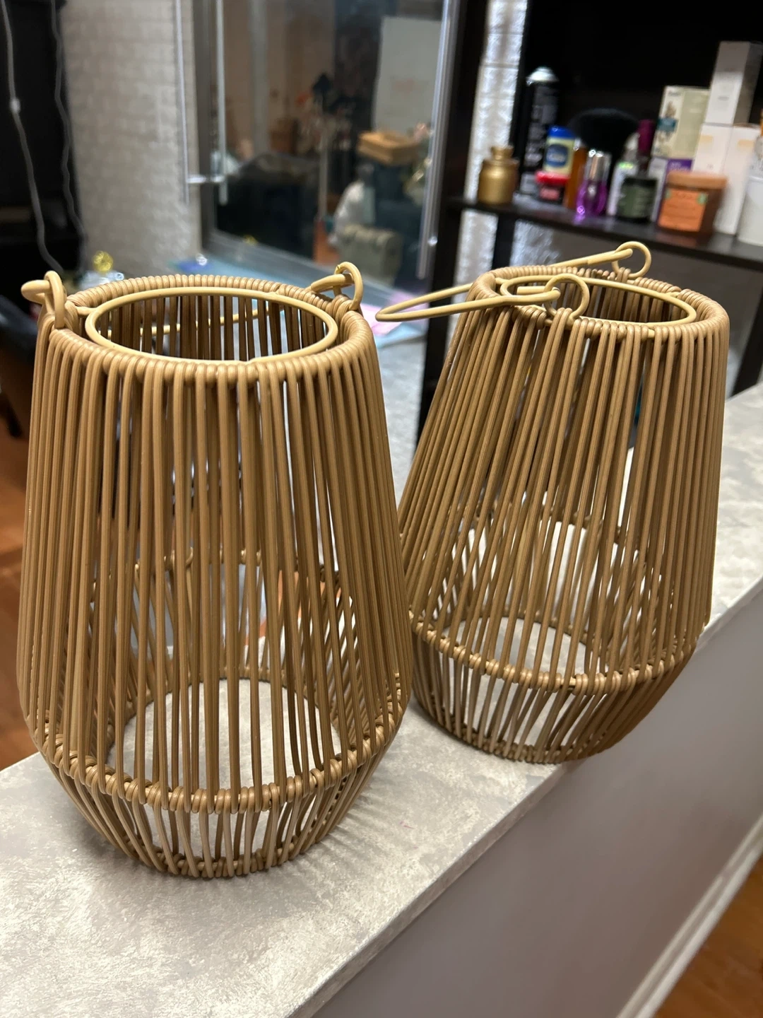 Two woven lanterns in a natural tan colour. These lanterns have a tapered shape and a wire handle at the top. They're perfect for adding a cozy ambiance to your space.