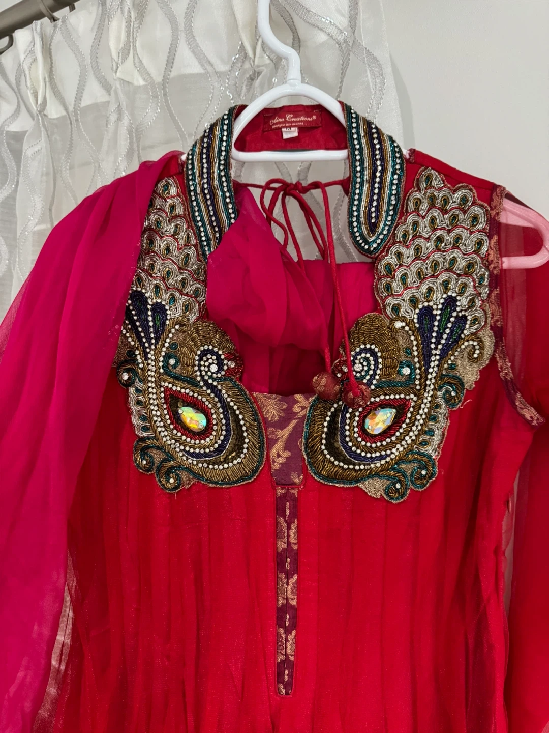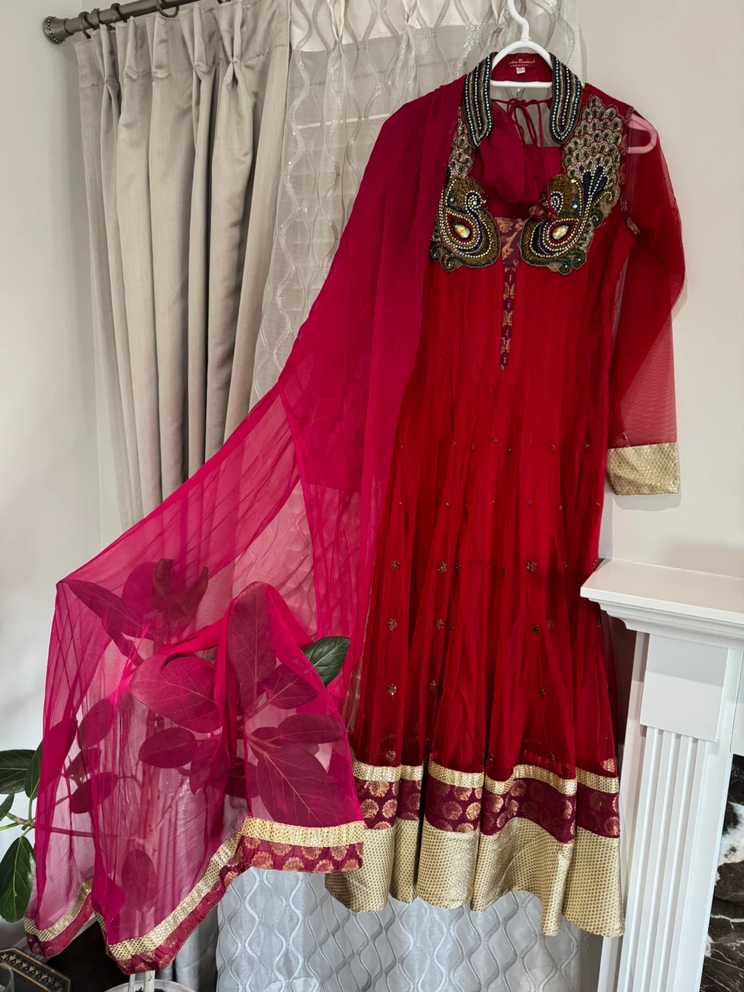 Beautiful red Anarkali suit featuring intricate beadwork and embellishments on the collar and sleeves. It comes with a matching sheer dupatta and churidaar. This outfit is perfect for celebrations and special events!