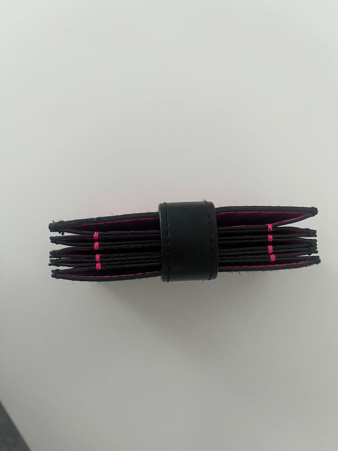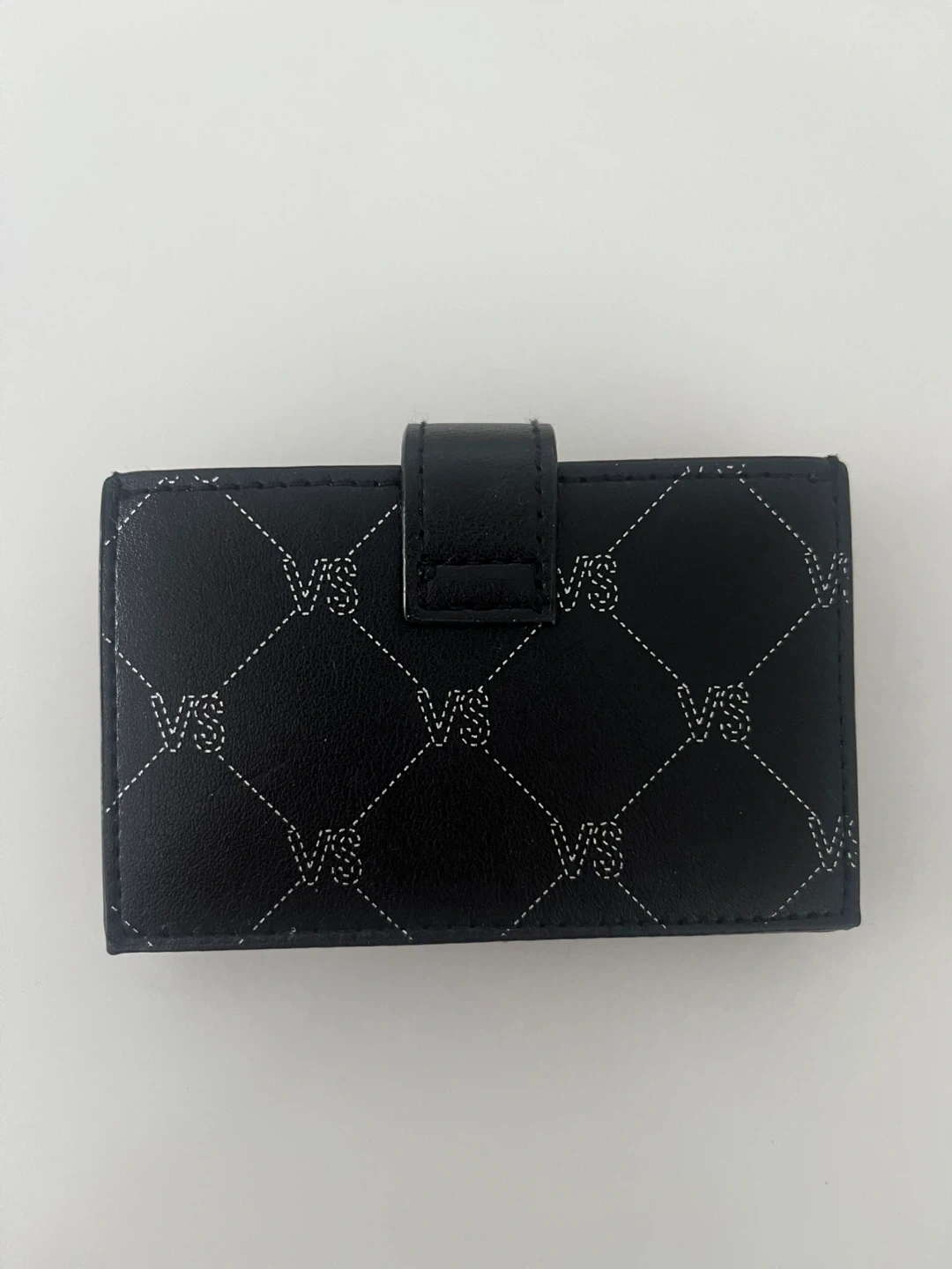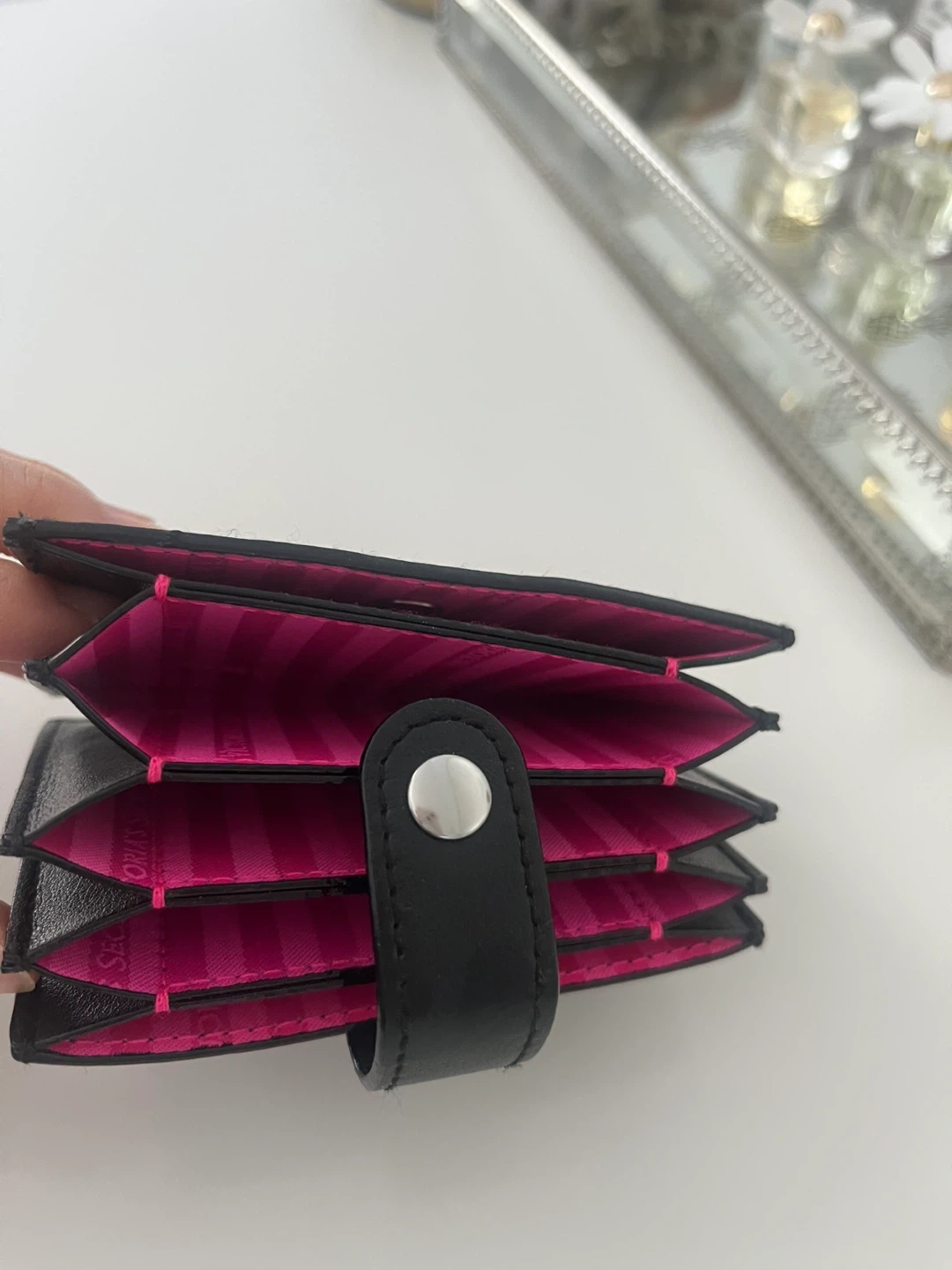 This black card holder features the Victoria's Secret logo in bright pink. It has multiple slots to keep your cards organized. It's a stylish way to carry your essentials!