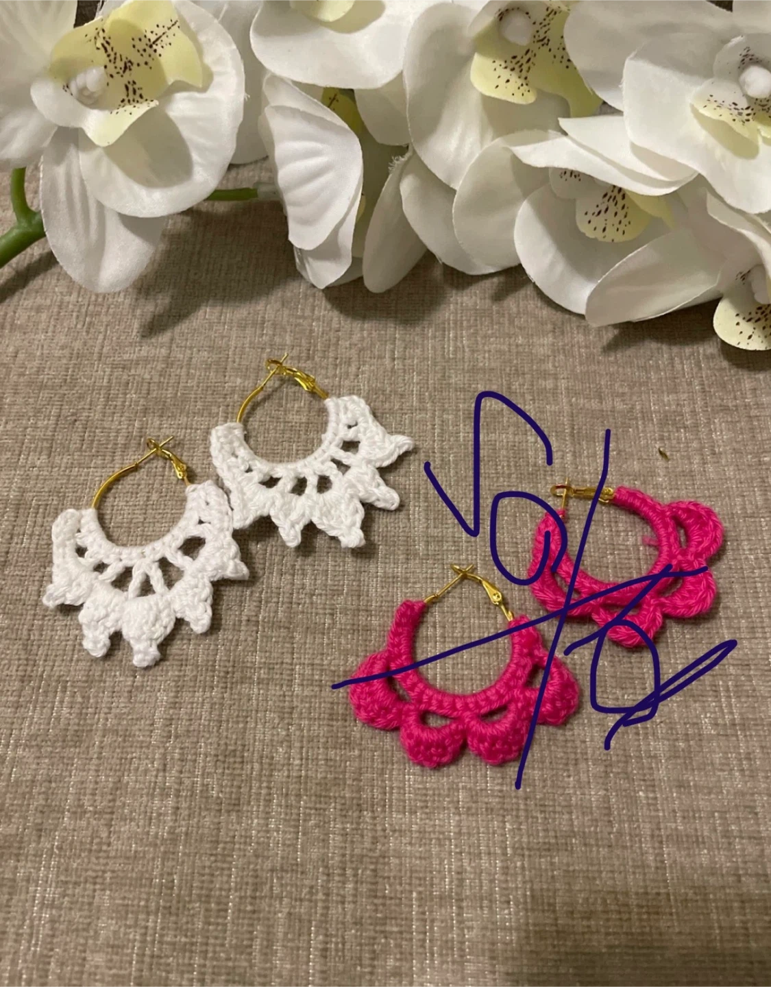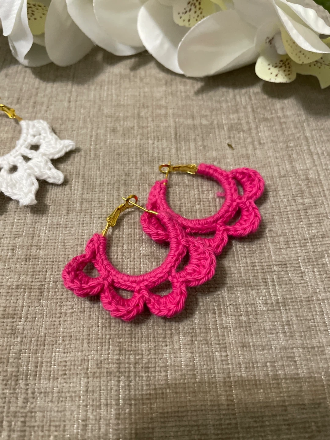 These are a cute pair of handmade hoop earrings. They're made from crochet thread and feature gold-tone hardware. Available in vibrant pink and classic white.