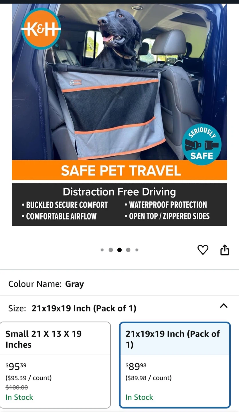 Keep your pet secure while traveling with this K&H Buckle n' Go Pet Seat. It's a large, gray seat designed for use on the left or right side of a vehicle's back seat. Add your pet's favourite blanket for extra comfort and sense of security! Dimensions: 21" L x 19" W x 19" H.