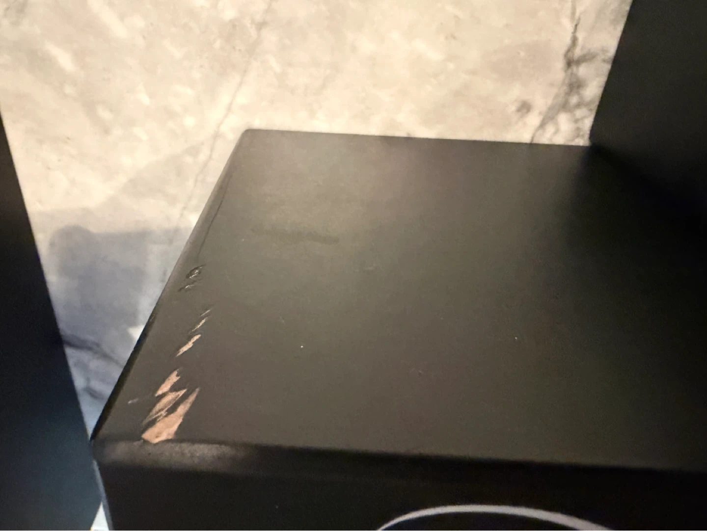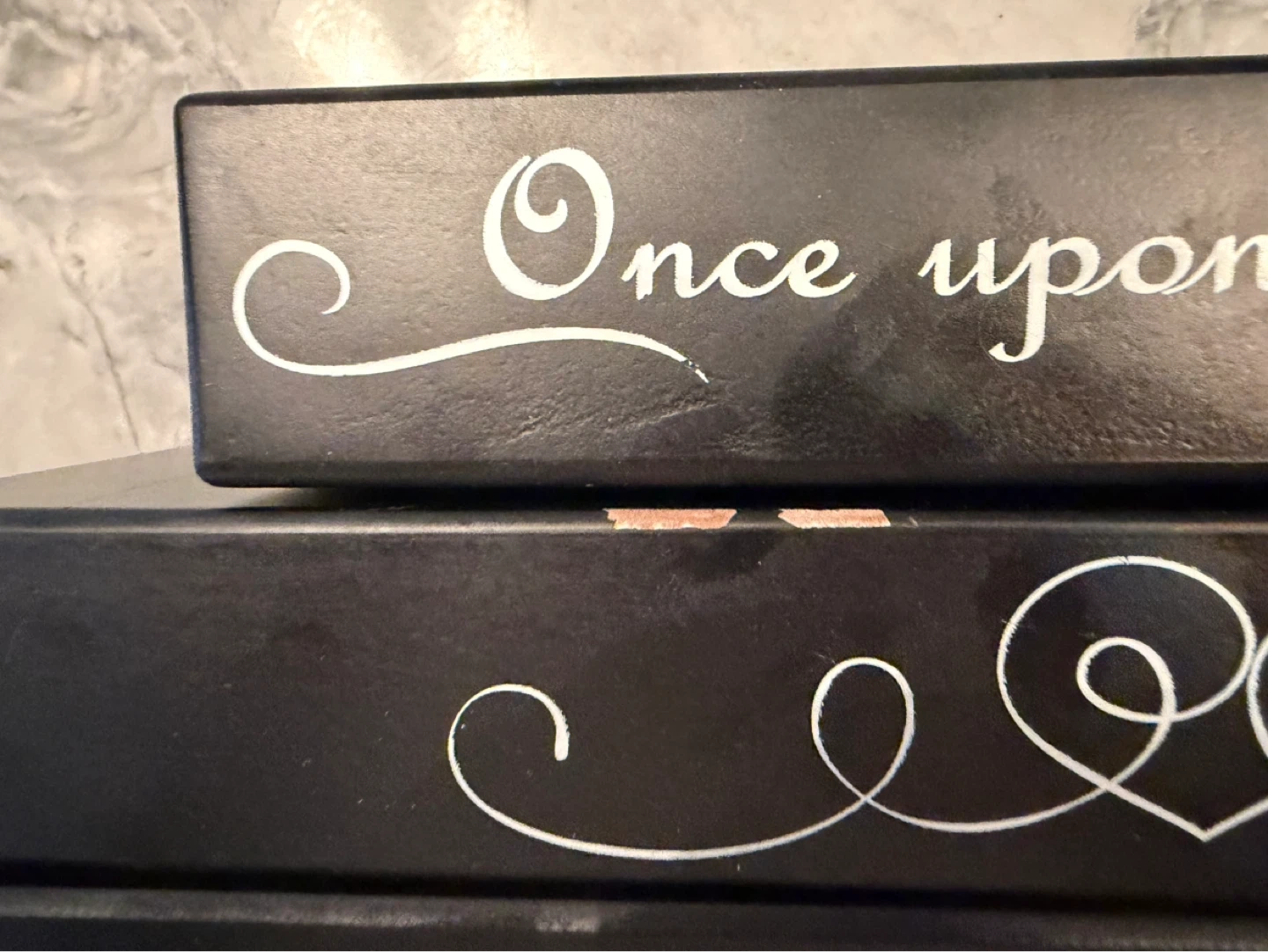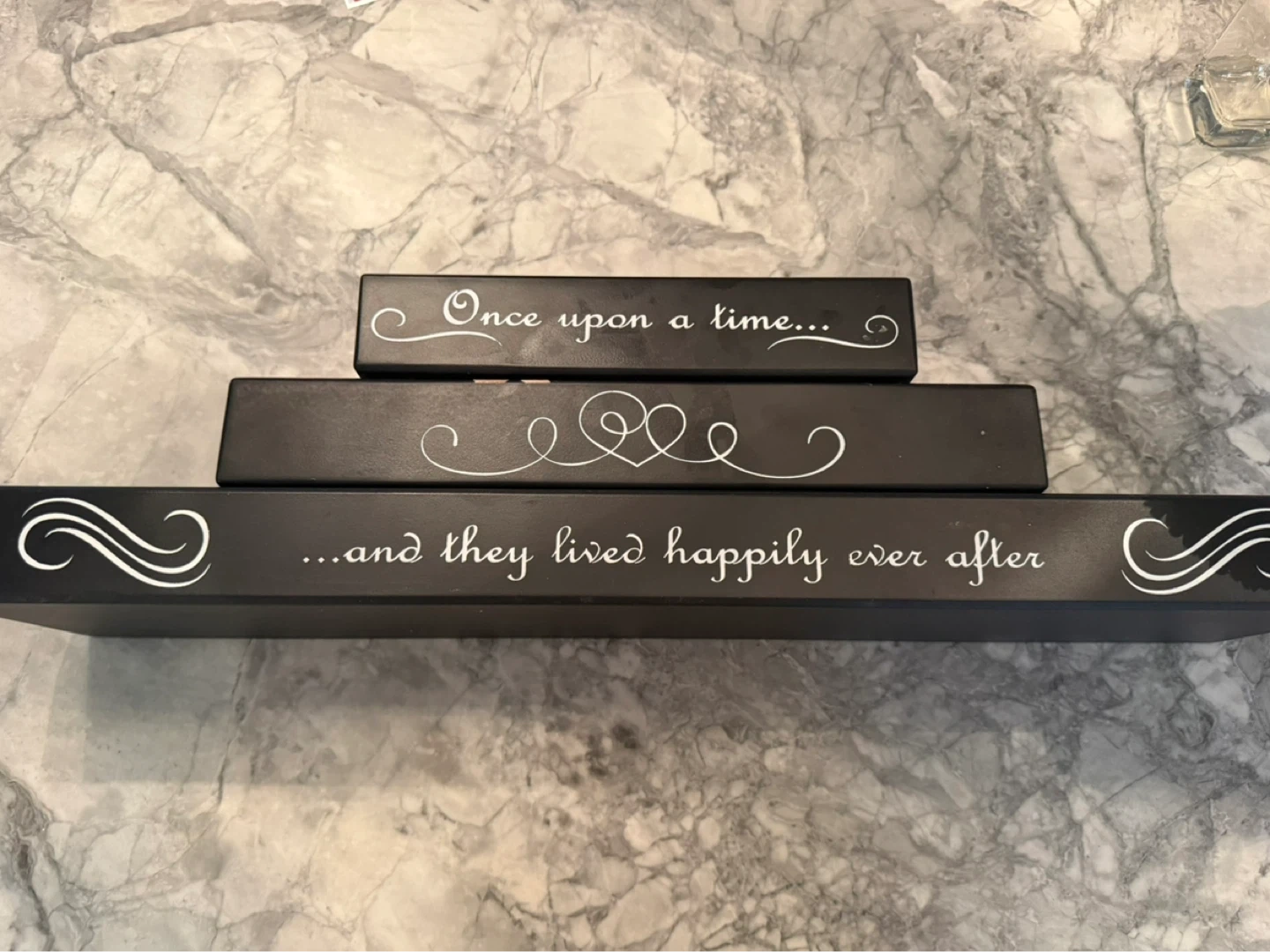 Set of three black decorative floating shelves with white lettering. Two smaller shelves read "Once upon a time..." and "...and they lived happily ever after". Great for home decor! Some minor scratches. Porch pick up east yor in Greektown