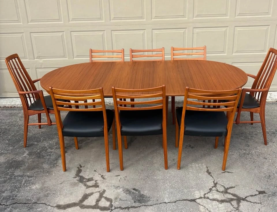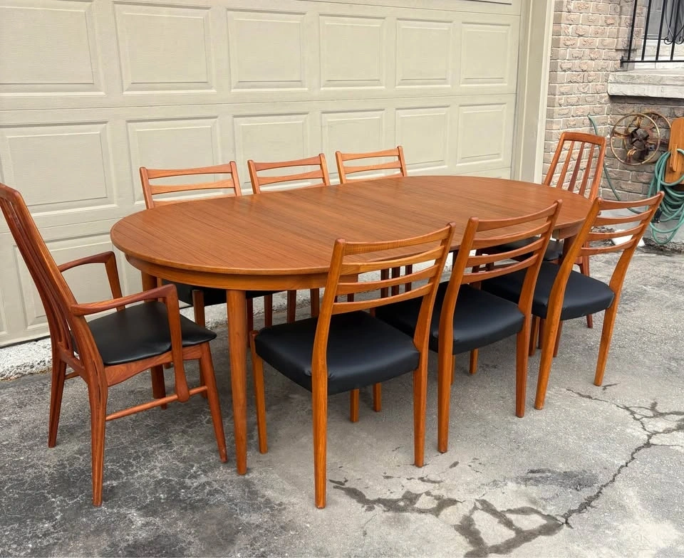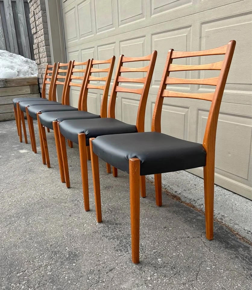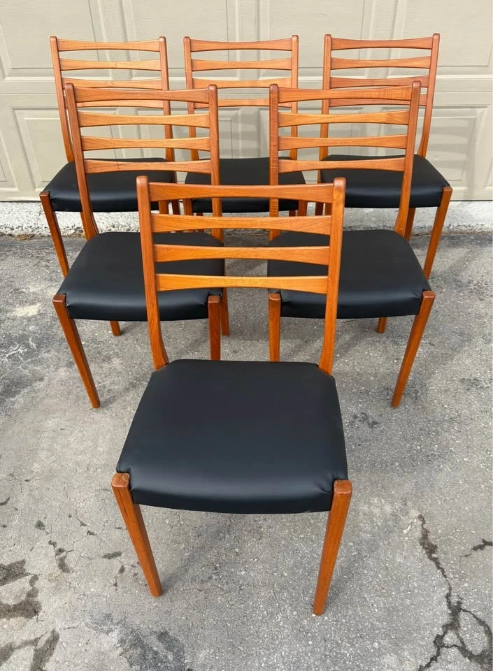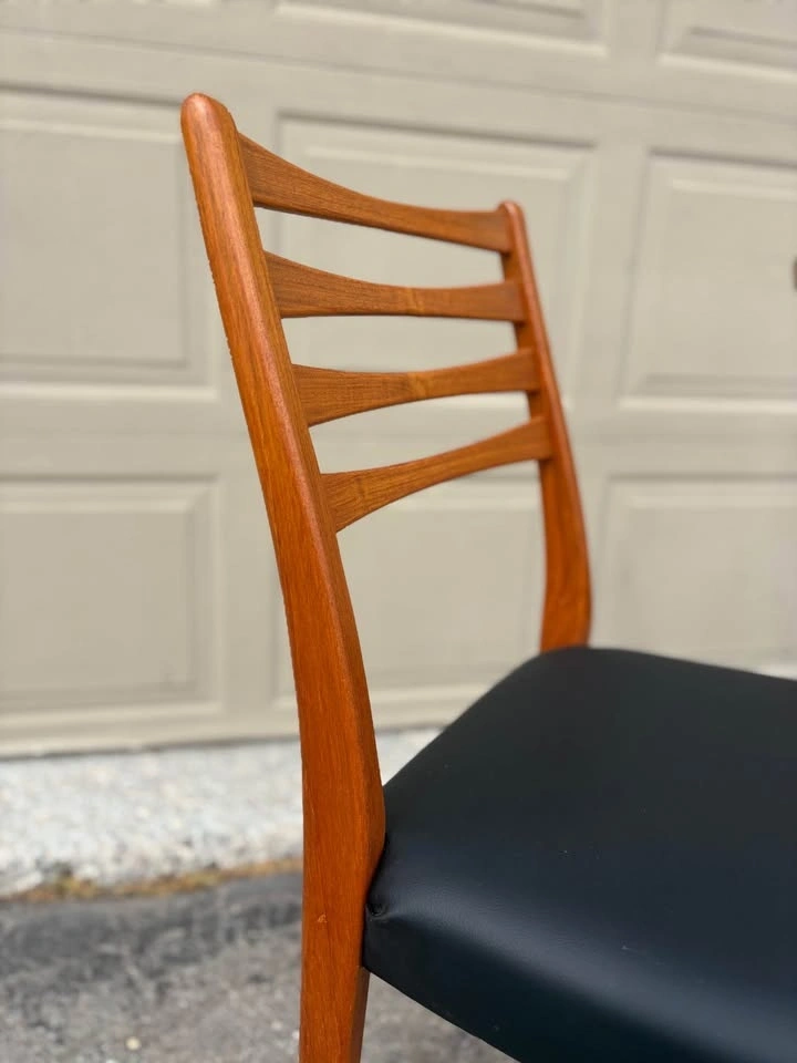 Beautiful Teak MCM dining chairs by Svegards. Chairs have been completely refurbished, frames stripped to raw wood and finished with several coats of hand-rubbed Osmo hard wax oil. All new black vegan leather upholstery. Price listed is per chair. Thanks for viewing.