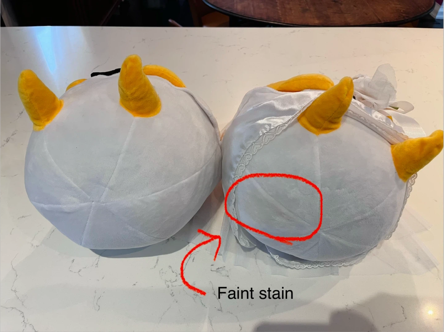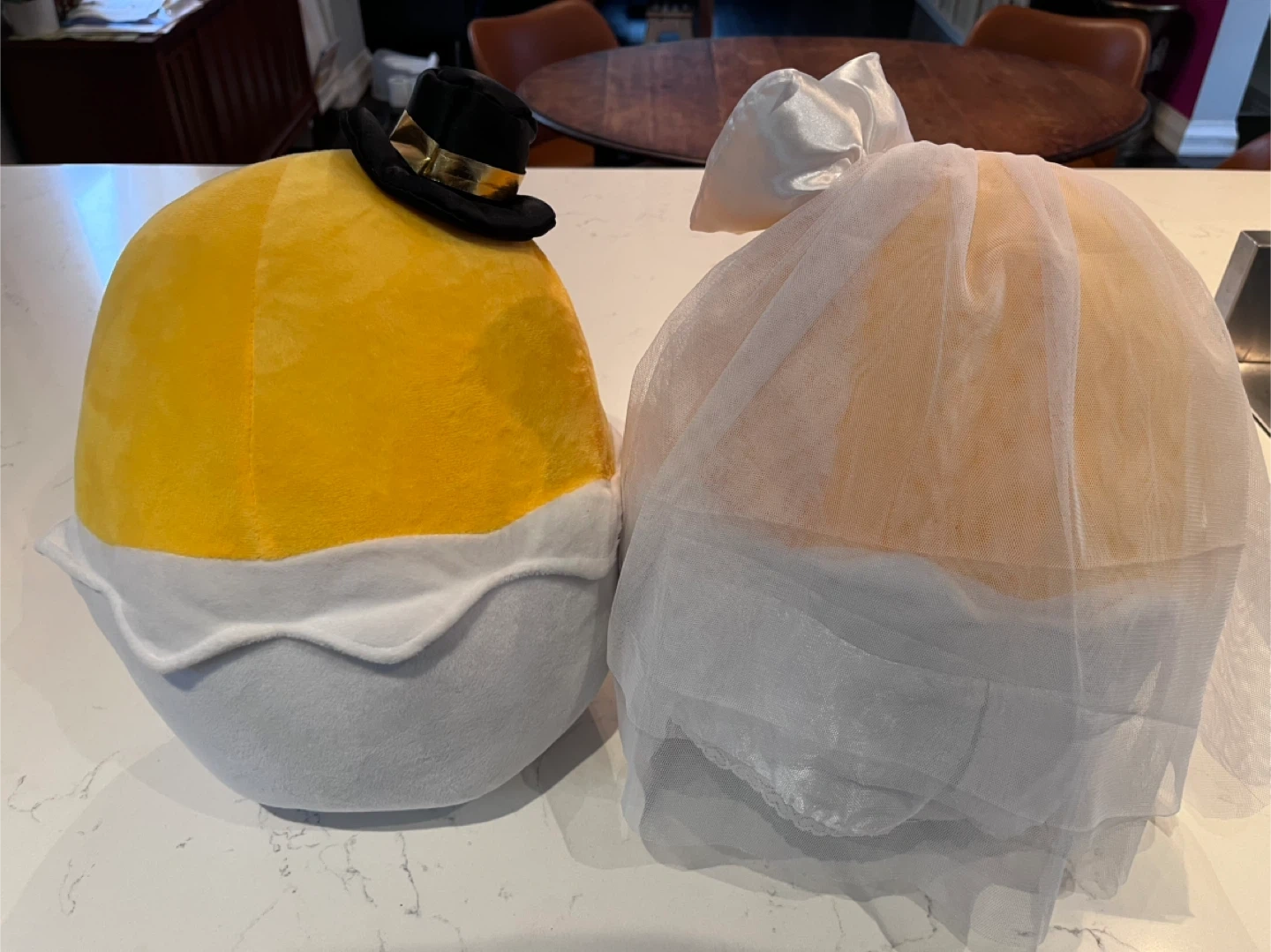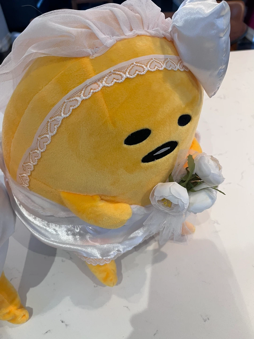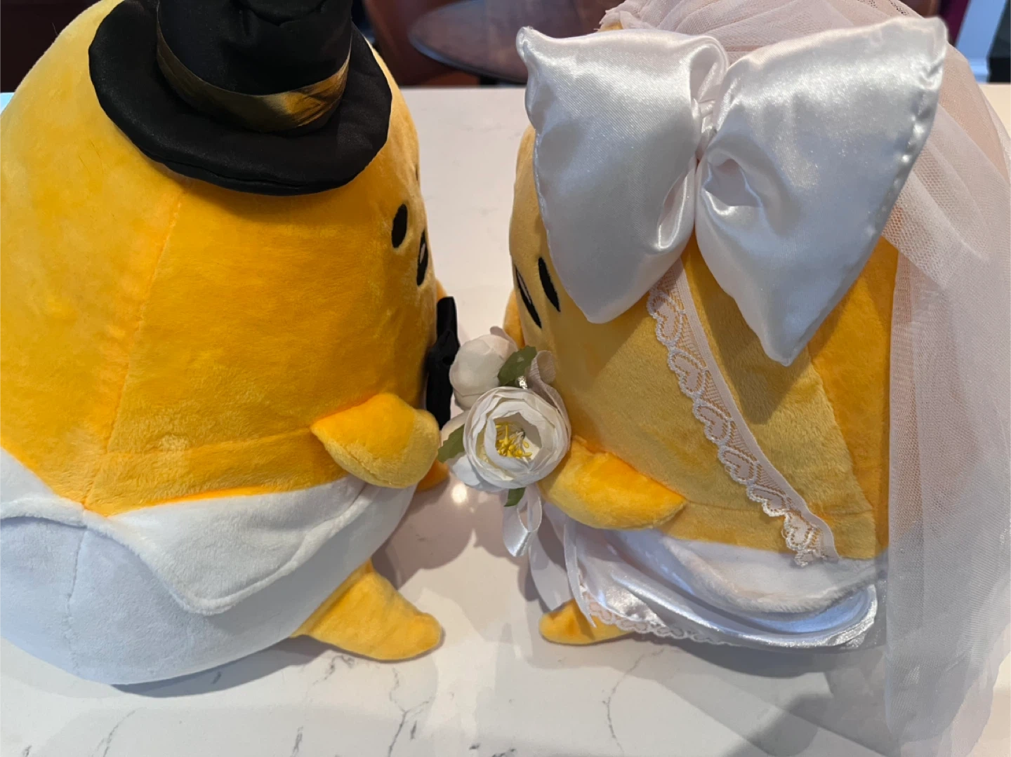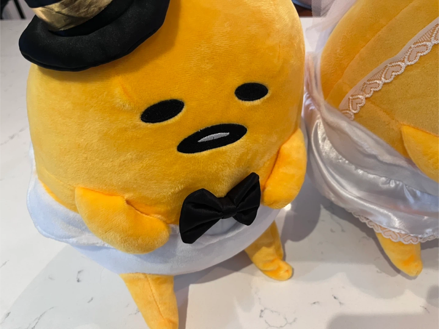 A set of 2 large gudetama plush, each standing 11.5” high and 10.5” wide. All clothing/flowers/ribbons/veil attached and in good condition. A very faint stain on the underside of the bride (see last photo). No tags or box.