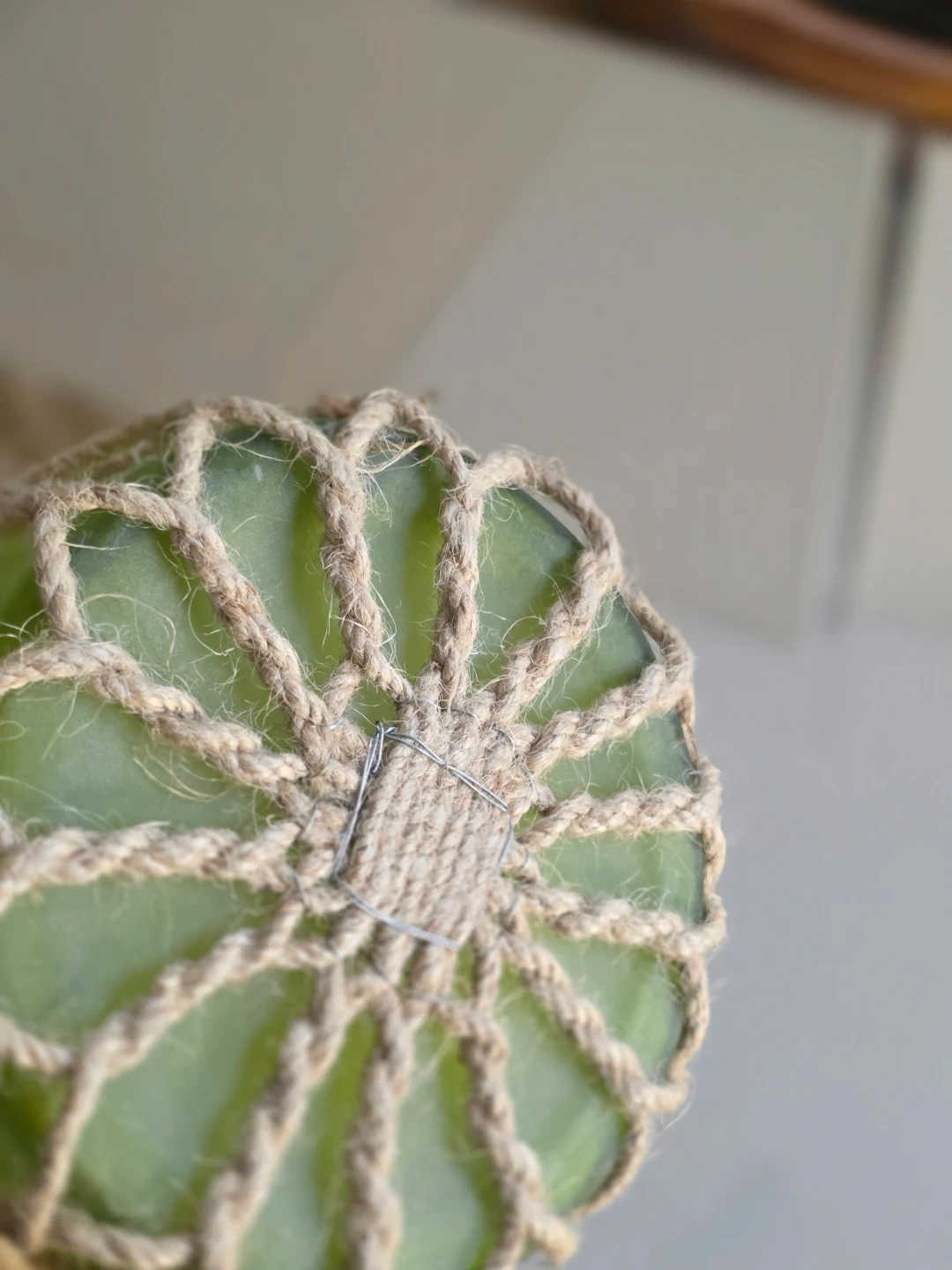 Design: The rope is tied in a loose knot pattern, often called macramé, which historically was a functional way for sailors to protect glass fishing buoys from breaking.