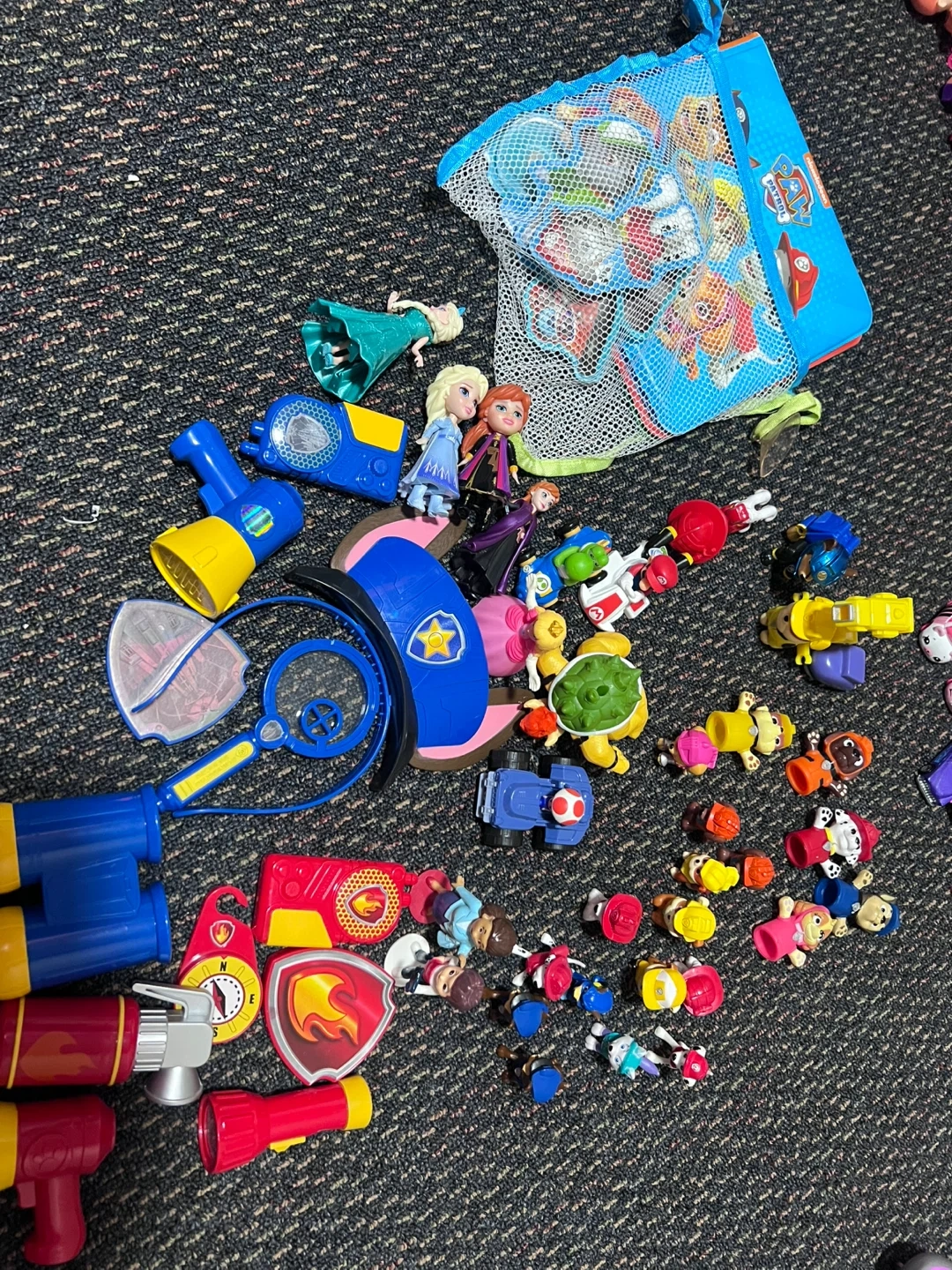 This is a collection of toy vehicles, including Paw Patrol characters and other assorted cars, planes, and emergency vehicles. Great for imaginative play!