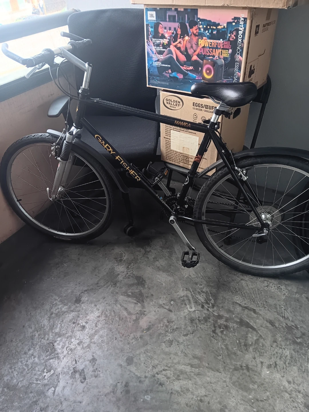 A black Gary Fisher mountain bike, model "MAMBA". It's designed in California and made in the U.S.A. This bike is great for trails and casual riding.