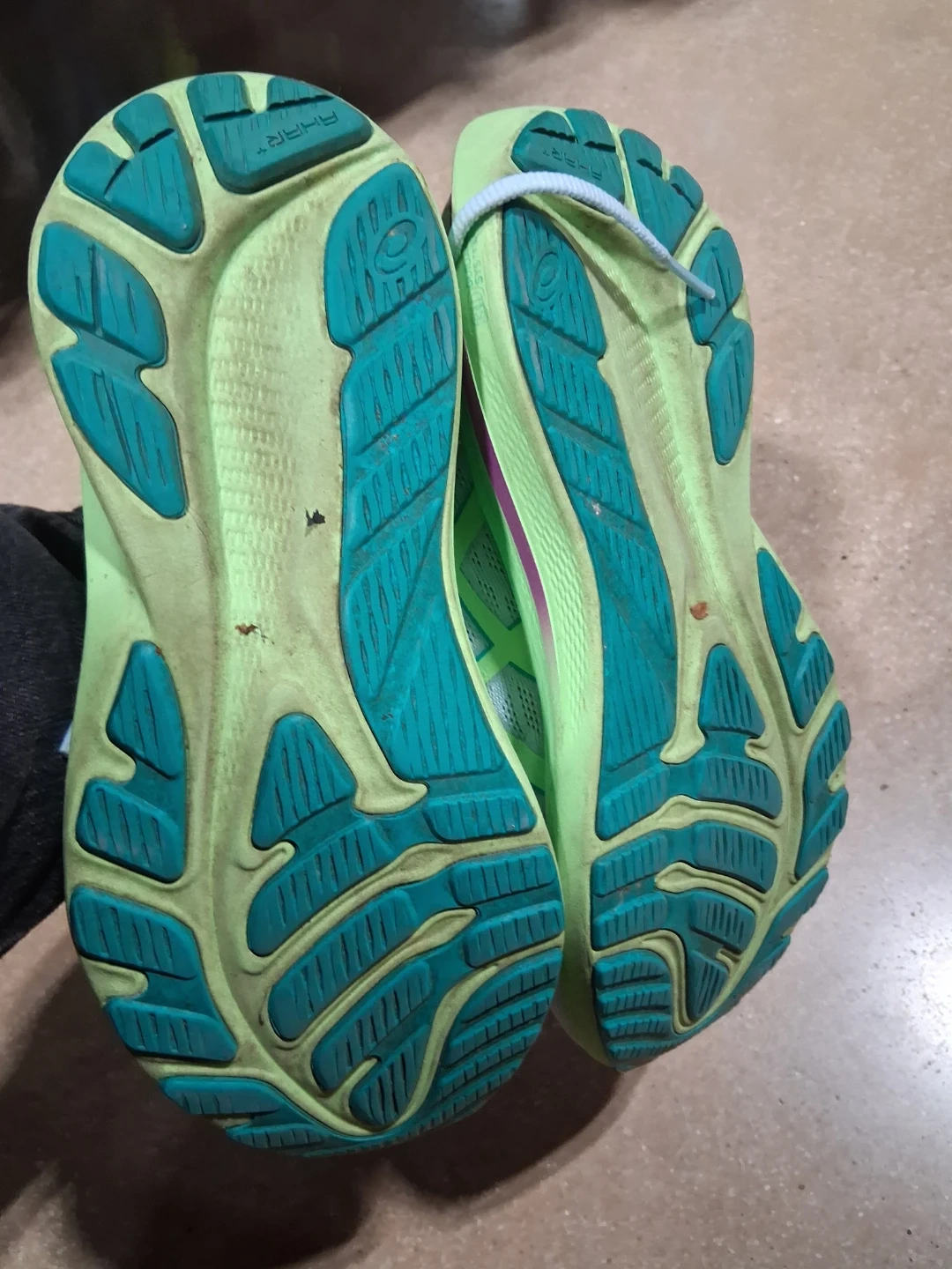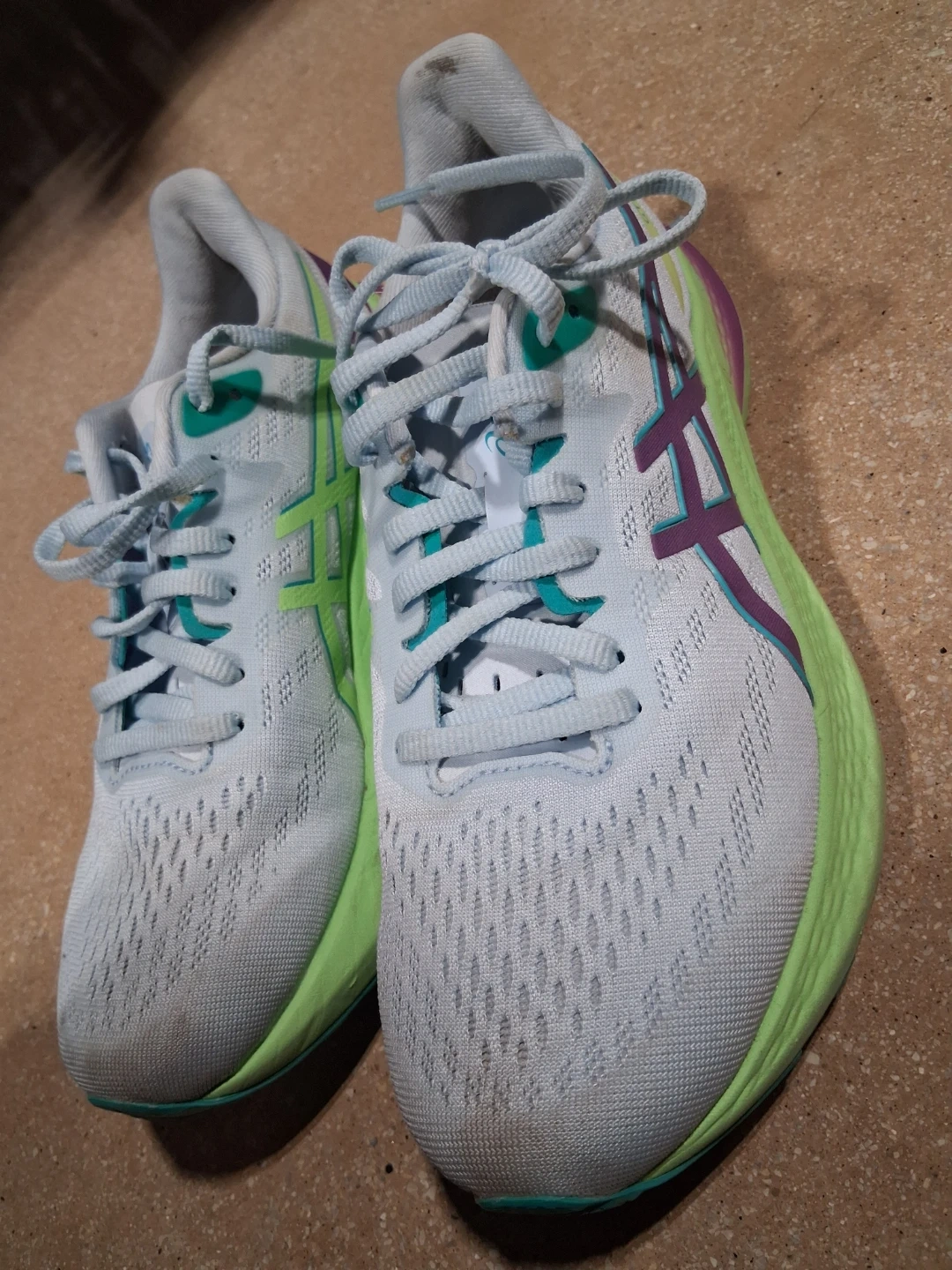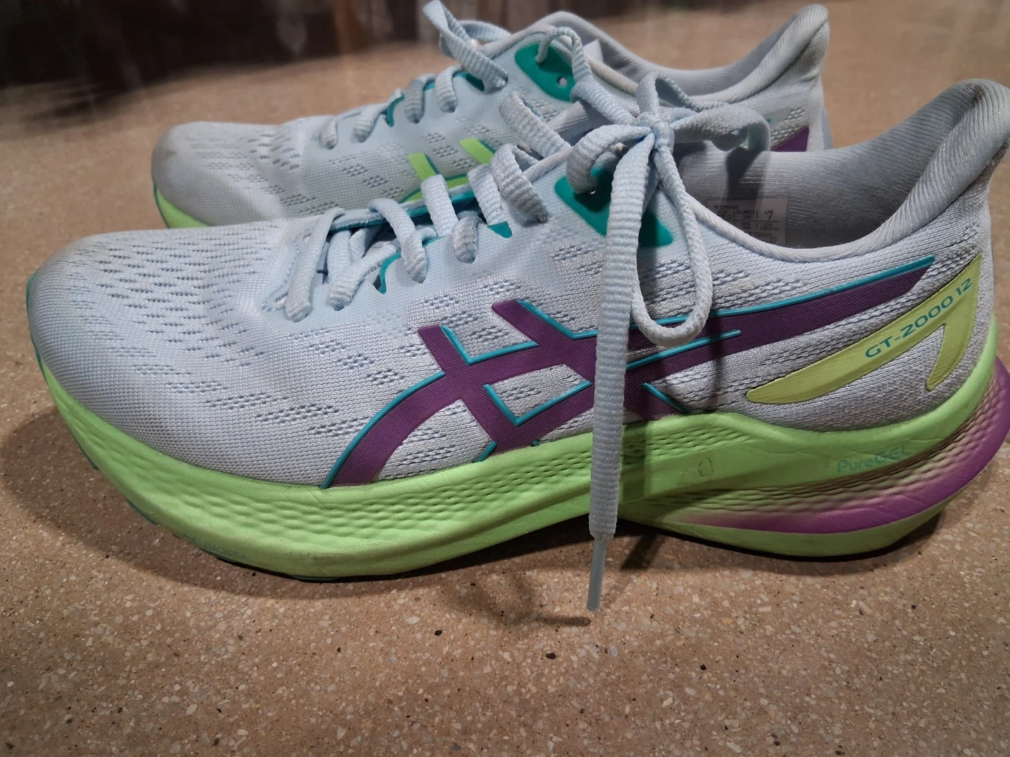These are ASICS GT-2000 12 running shoes. They're light blue with purple and lime green accents. Mesh upper and rubber sole construction.