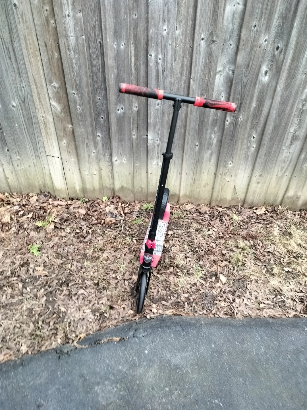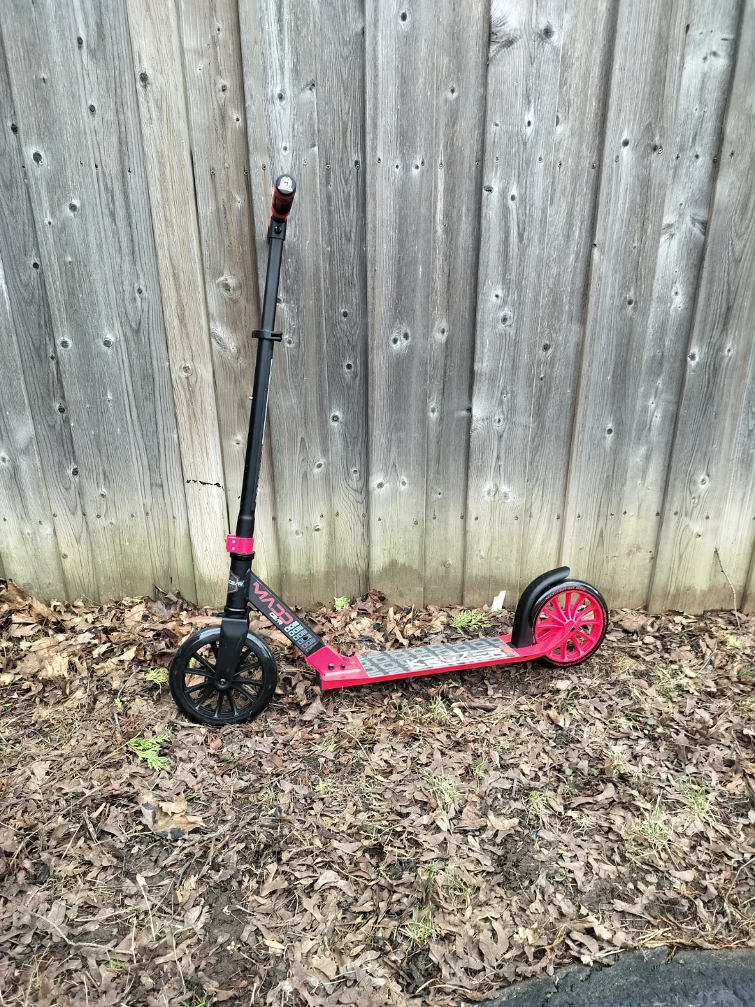 It's sized for adults. It's easy to balance on because of the large wheels. The rear brake pad is worn out and there is no front brake.