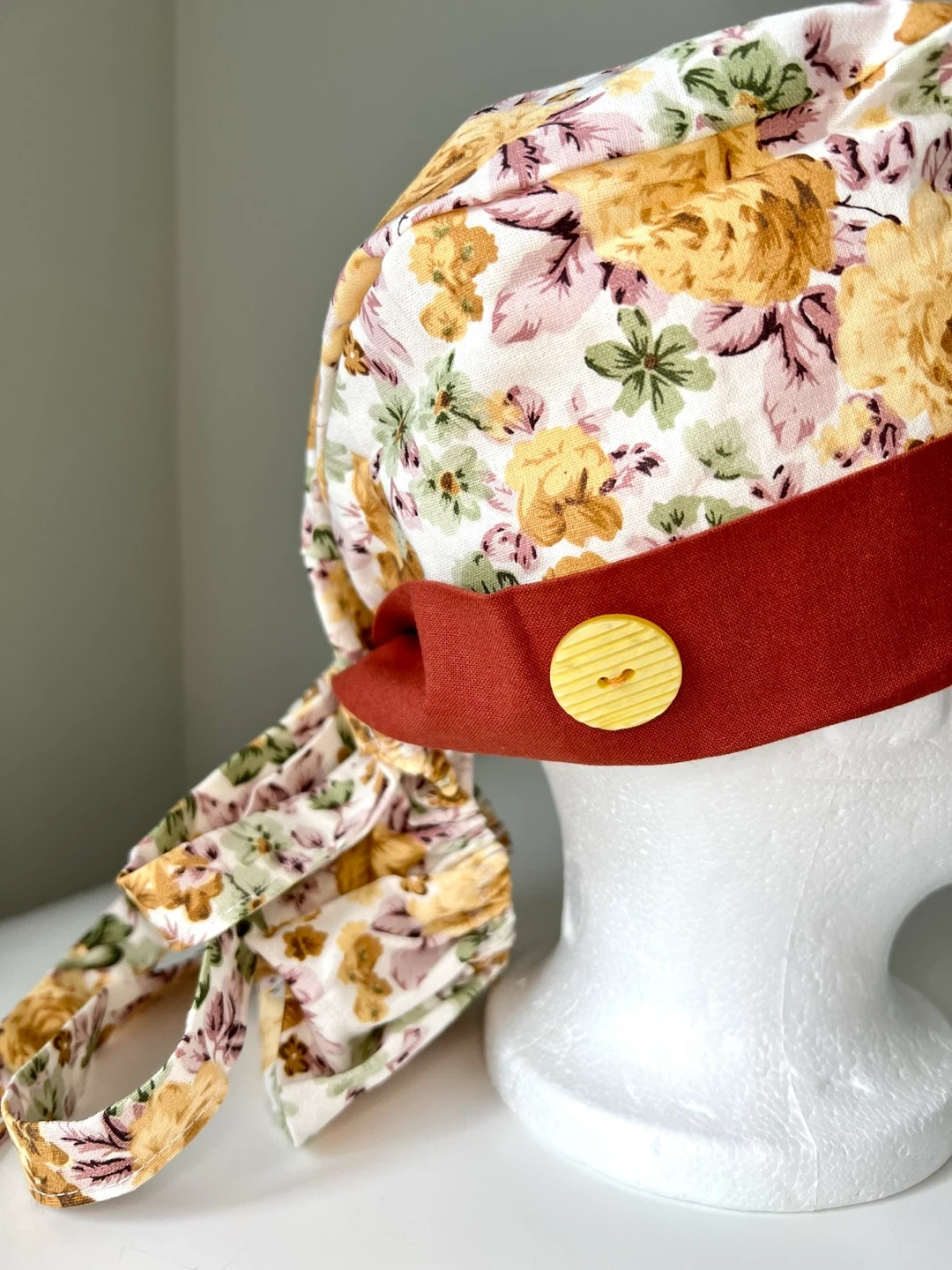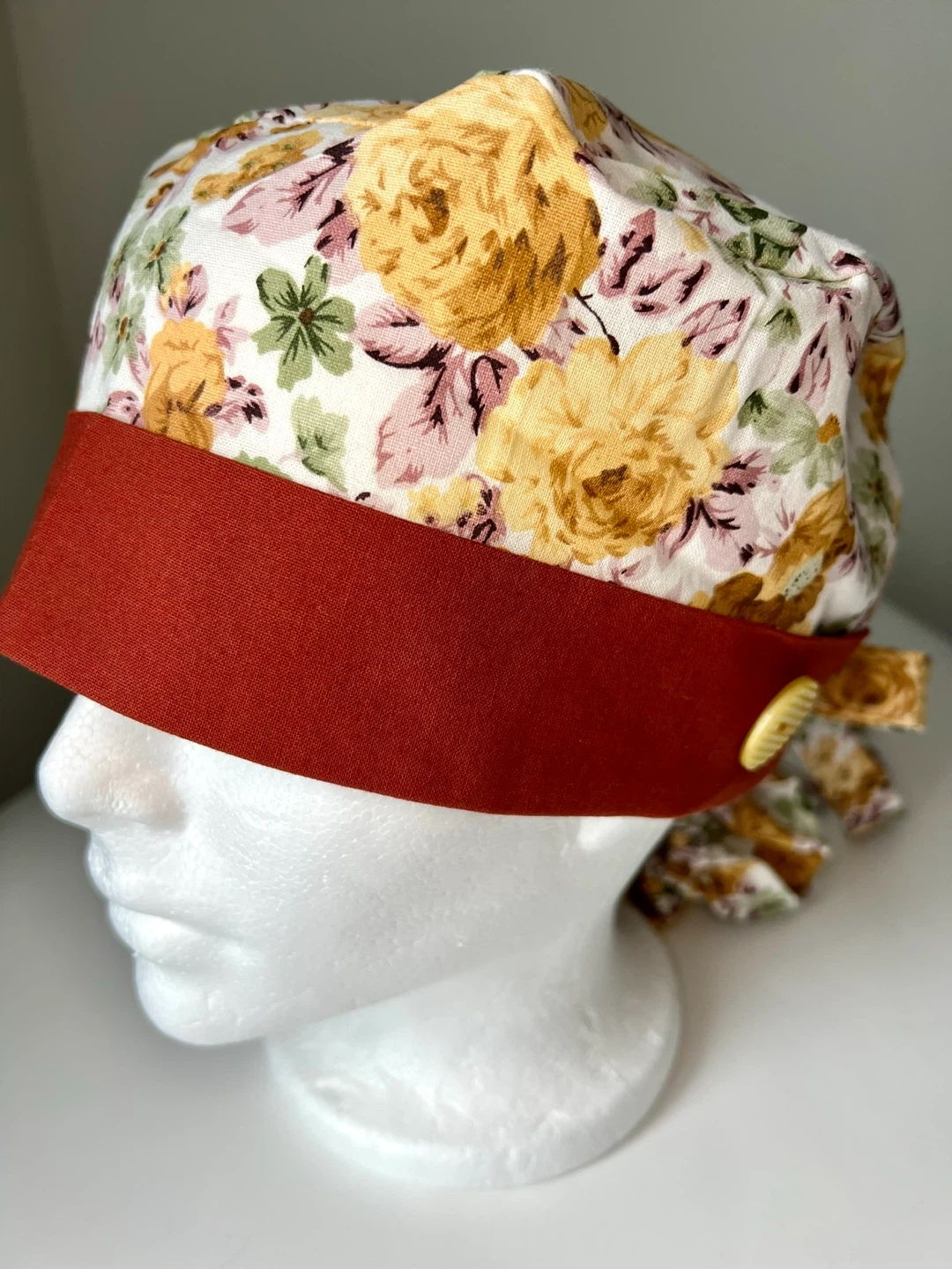 Handmade This is a scrub cap with a floral pattern and a burnt orange band. It features buttons on the side, which are handy for hanging masks. Ties at the back for an adjustable fit. Made from comfortable cotton fabric.