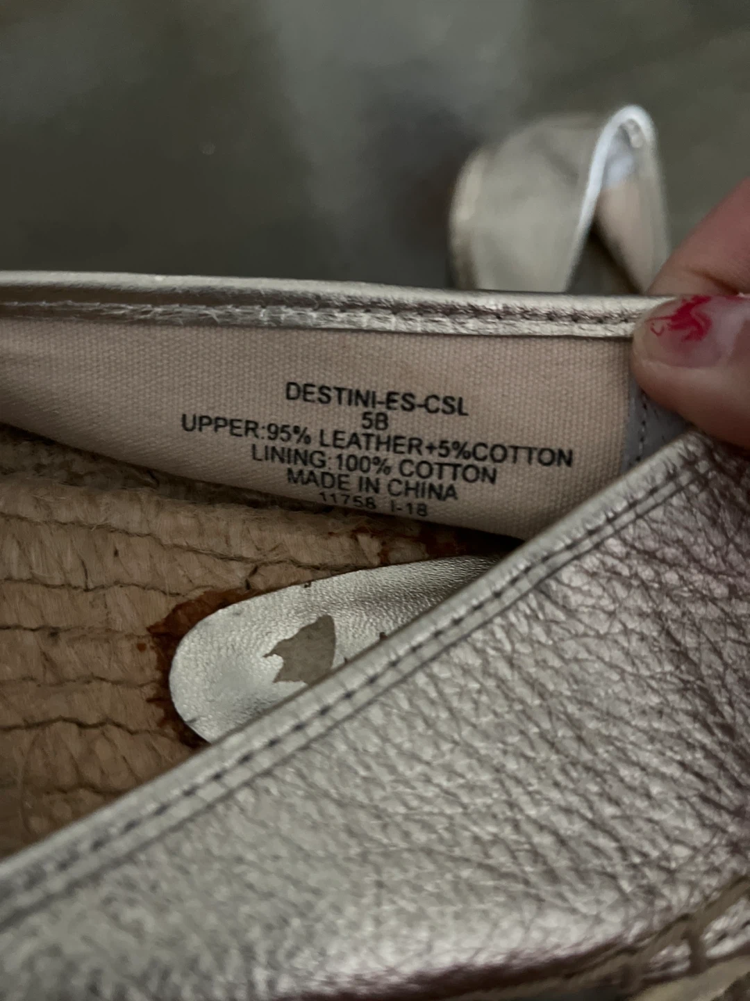 Lauren Ralph Lauren DESTINI espadrille flats in a shimmering silver colour. These shoes are made with a 95% leather and 5% cotton upper, and a 100% cotton lining. They were made in China. They're a slip-on style perfect for warmer weather!