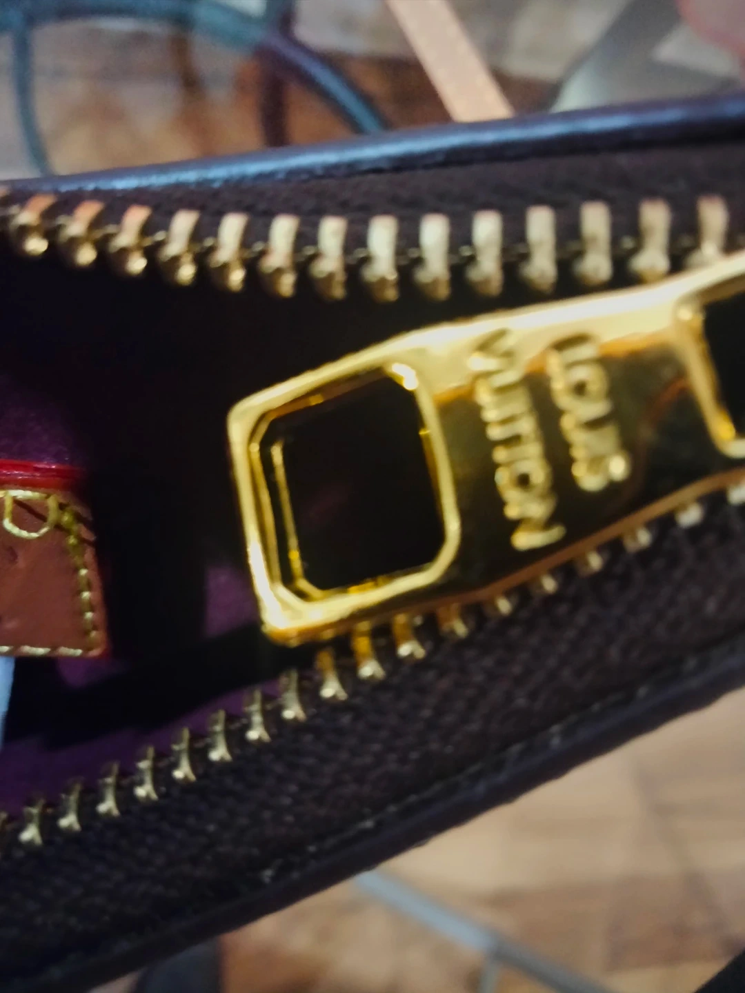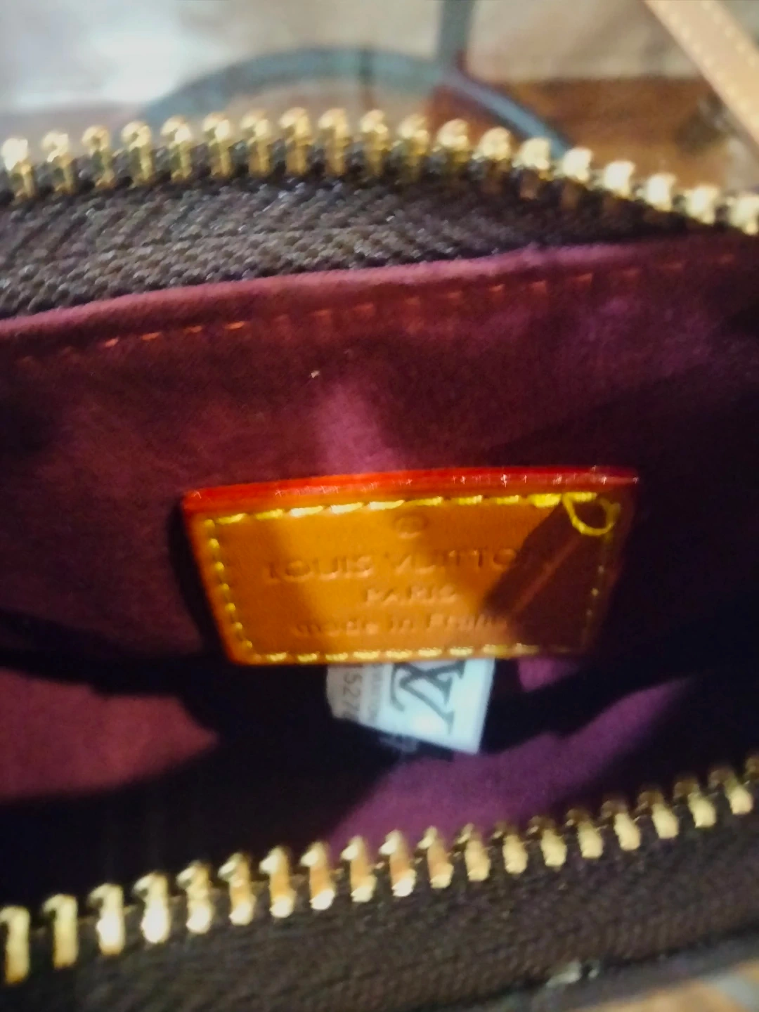 This is a Louis Vuitton pochette with the iconic monogram pattern. It's made in France and features gold-tone hardware. The interior is lined in a deep burgundy color.