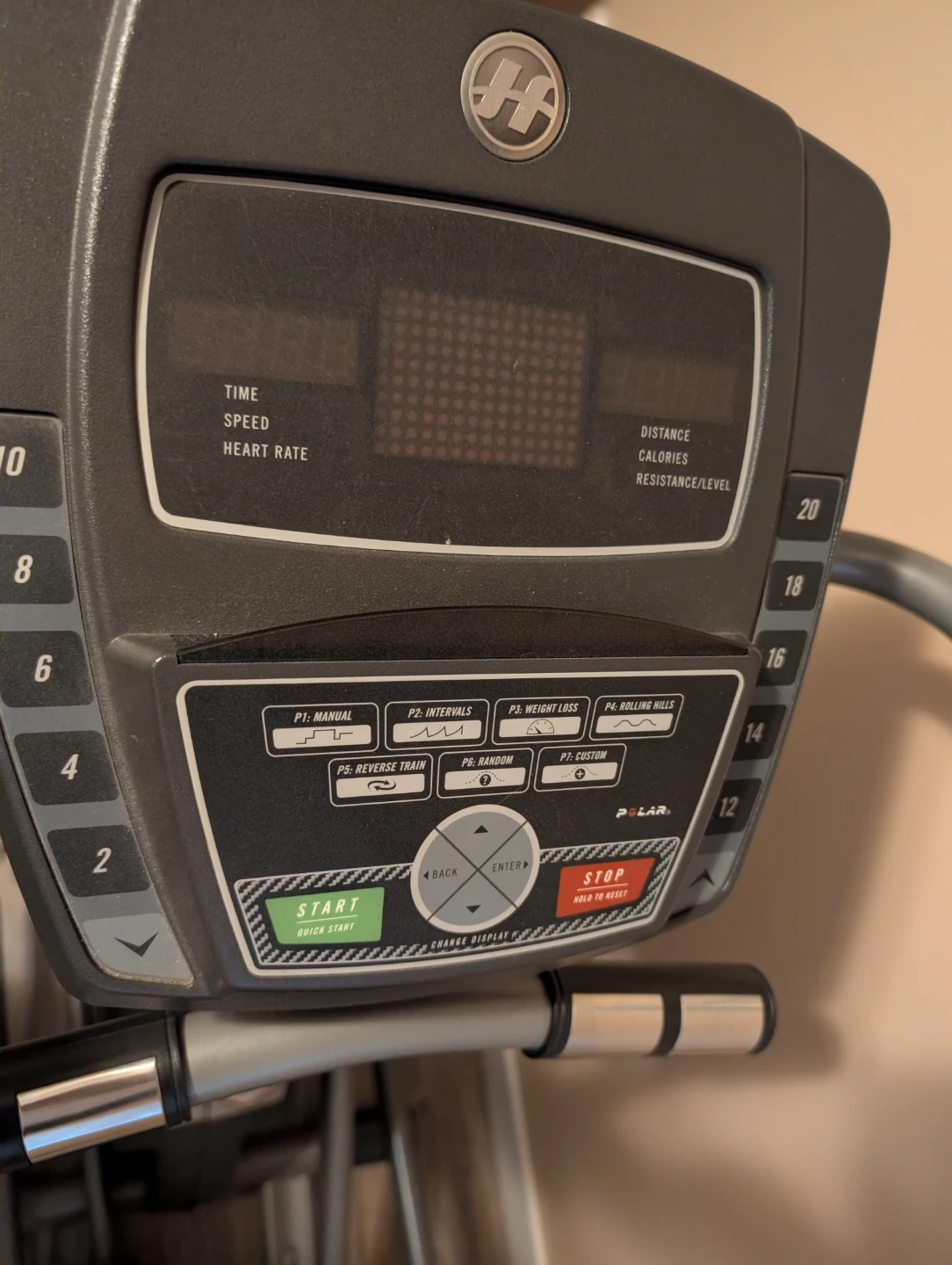 This Horizon elliptical trainer has a digital display showing time, speed, heart rate, distance, calories, and resistance level. It also offers multiple workout programs. It's great for home cardio workouts!