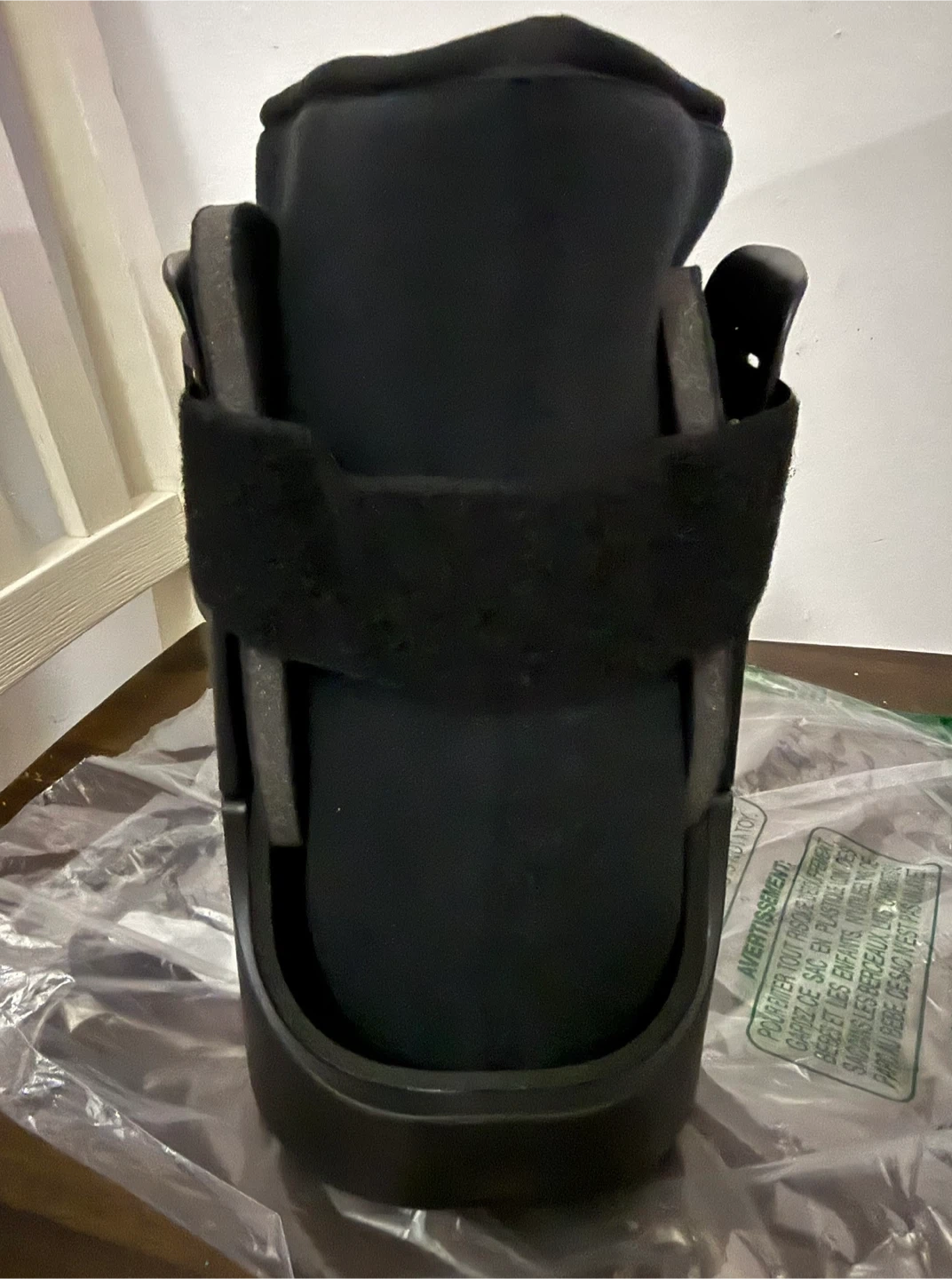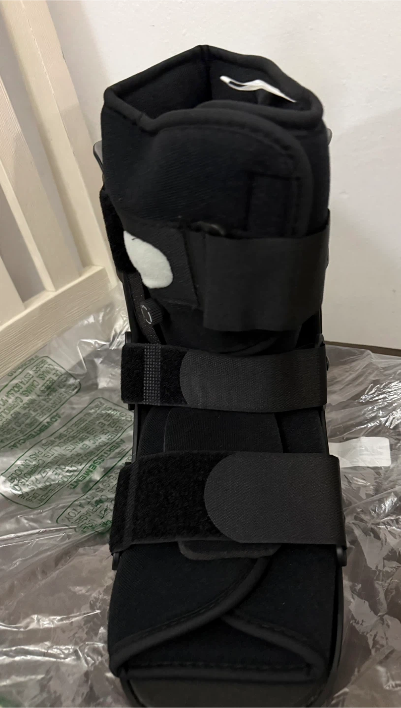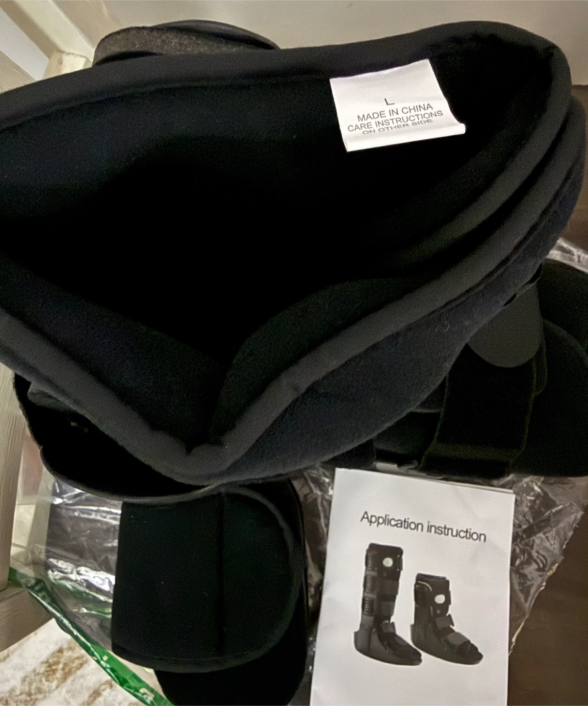 This is a black walker boot, size large. It features adjustable straps and a non-slip sole for stability. Includes application instructions.