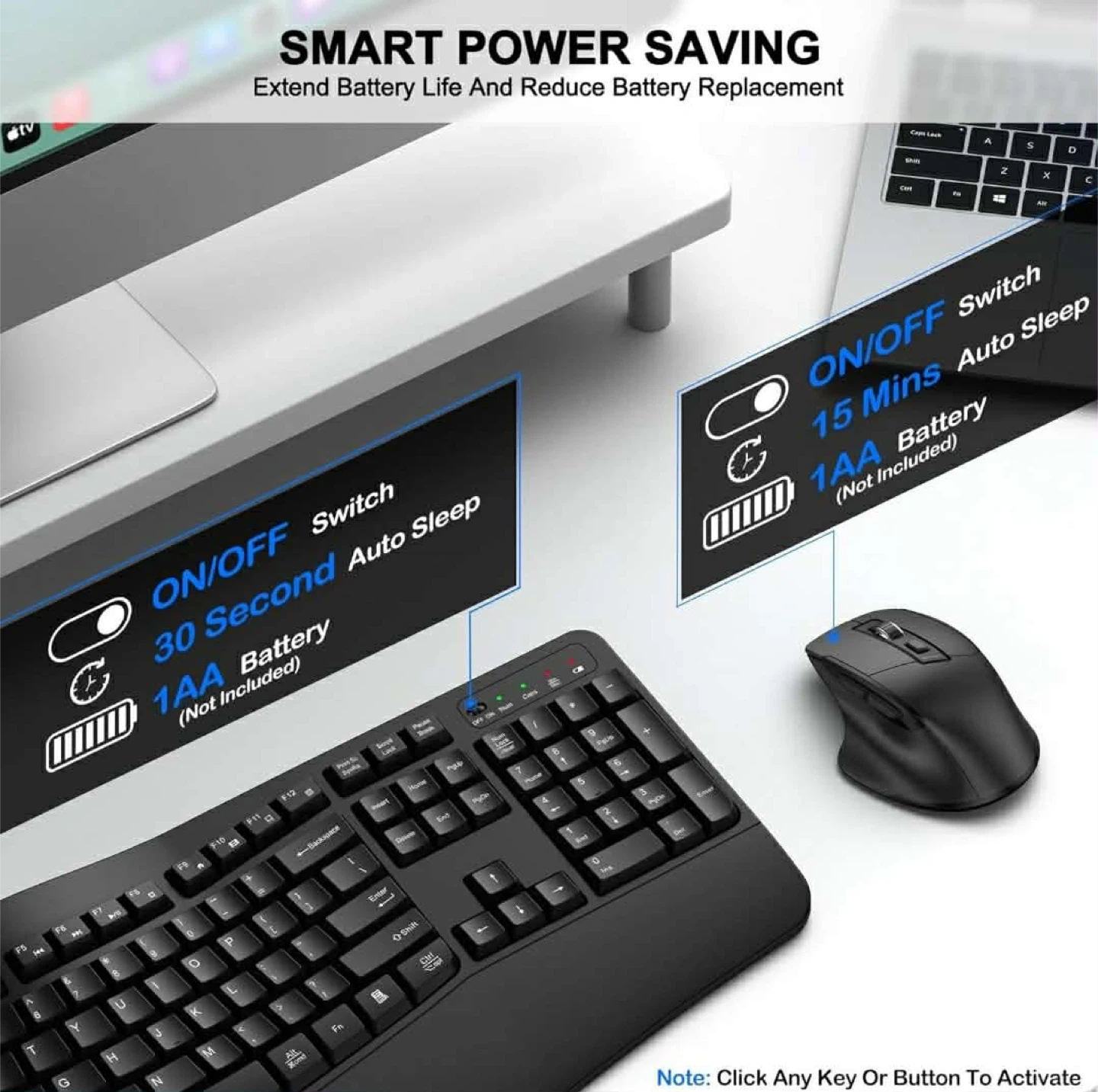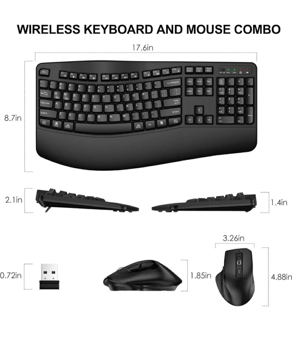 This is a wireless keyboard and mouse combo with an ergonomic wave design. It's powered by 1 AA battery (not included) and features smart power saving with auto-sleep modes. The keyboard measures 17.6 inches wide and 8.7 inches deep.