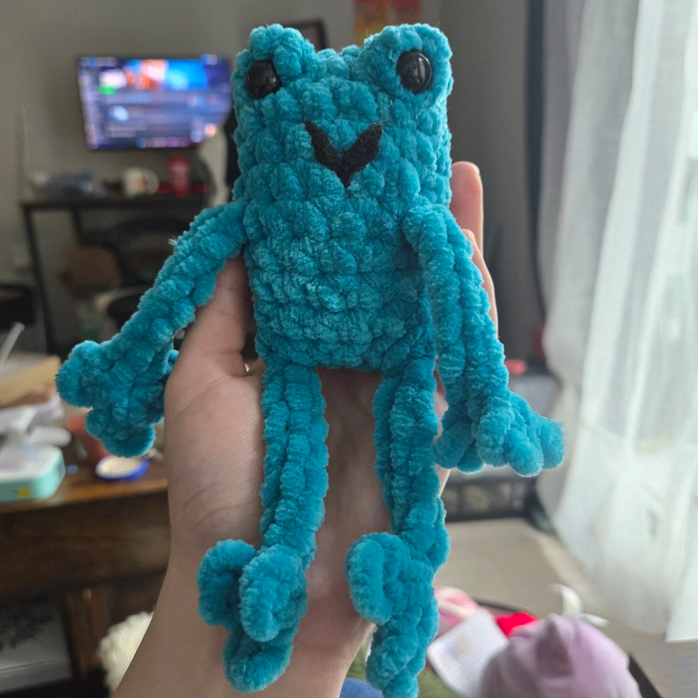 Cute teal frog plush toy, handmade with soft chenille yarn. It's got cute button eyes and a stitched smile. This little guy is perfect for cuddling or as a cheerful decoration!