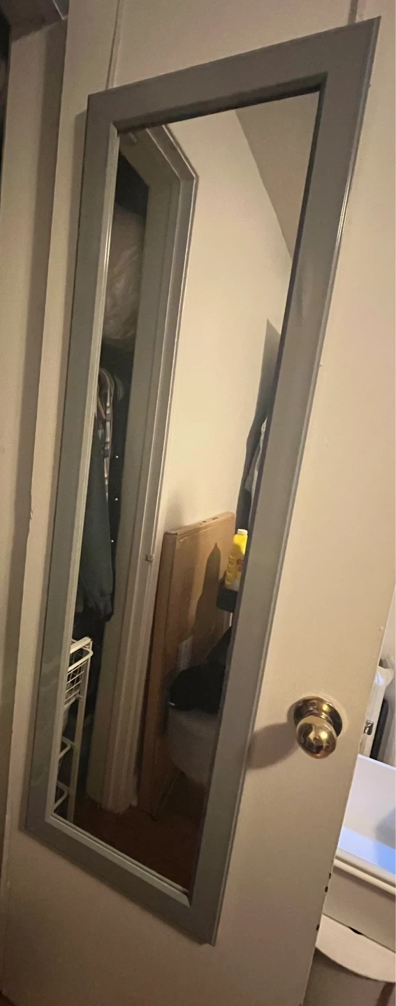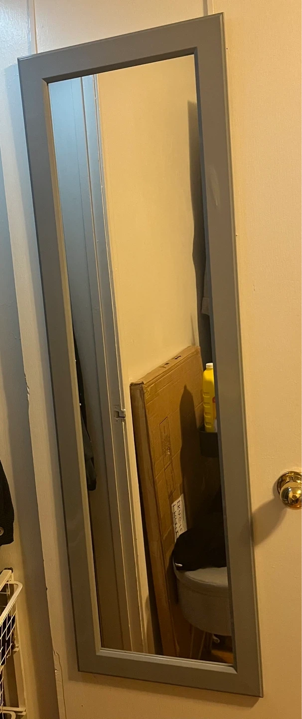 Selling a simple, modern full-length mirror with a grey frame. Can be easily mounted on the back of a door or on the wall—great for bedrooms, closets, or entryways.