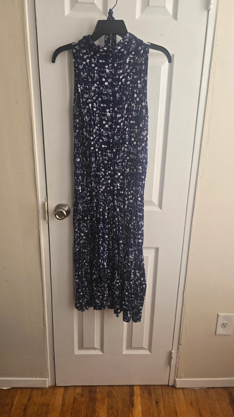 This is a sleeveless dress with a navy background and a white floral print. It's in great condition and ready for a new owner!