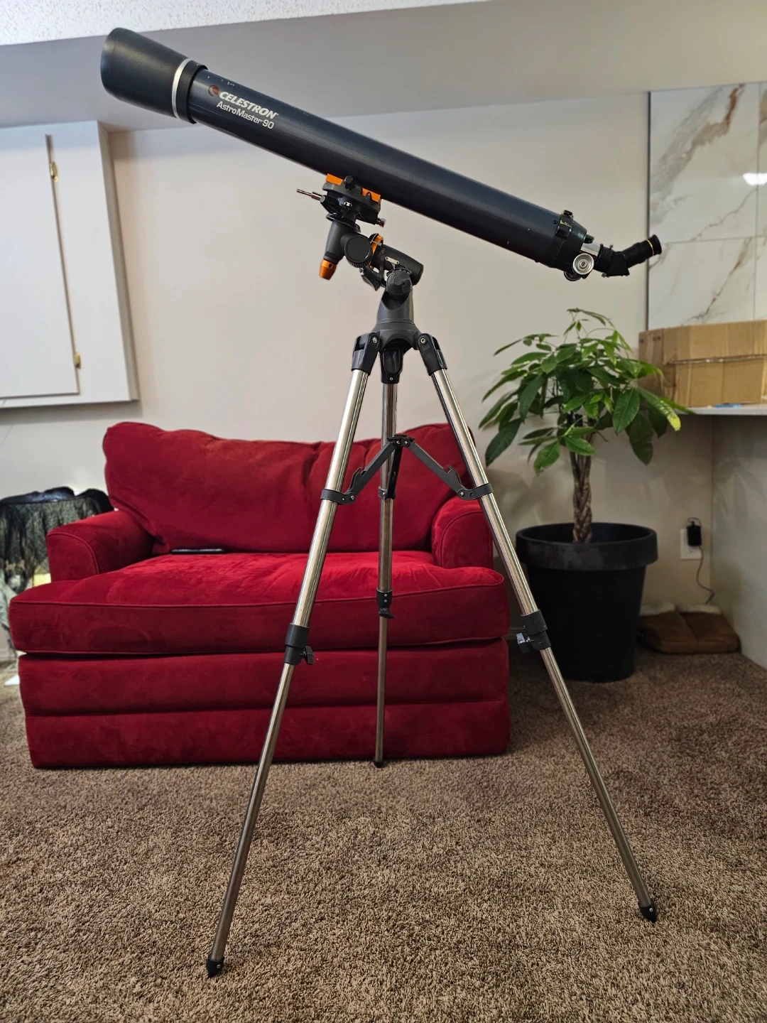 Celestron AstroMaster 90 refractor telescope on a tripod. Perfect for viewing planets and the moon. It offers bright, clear views for both terrestrial and celestial objects.