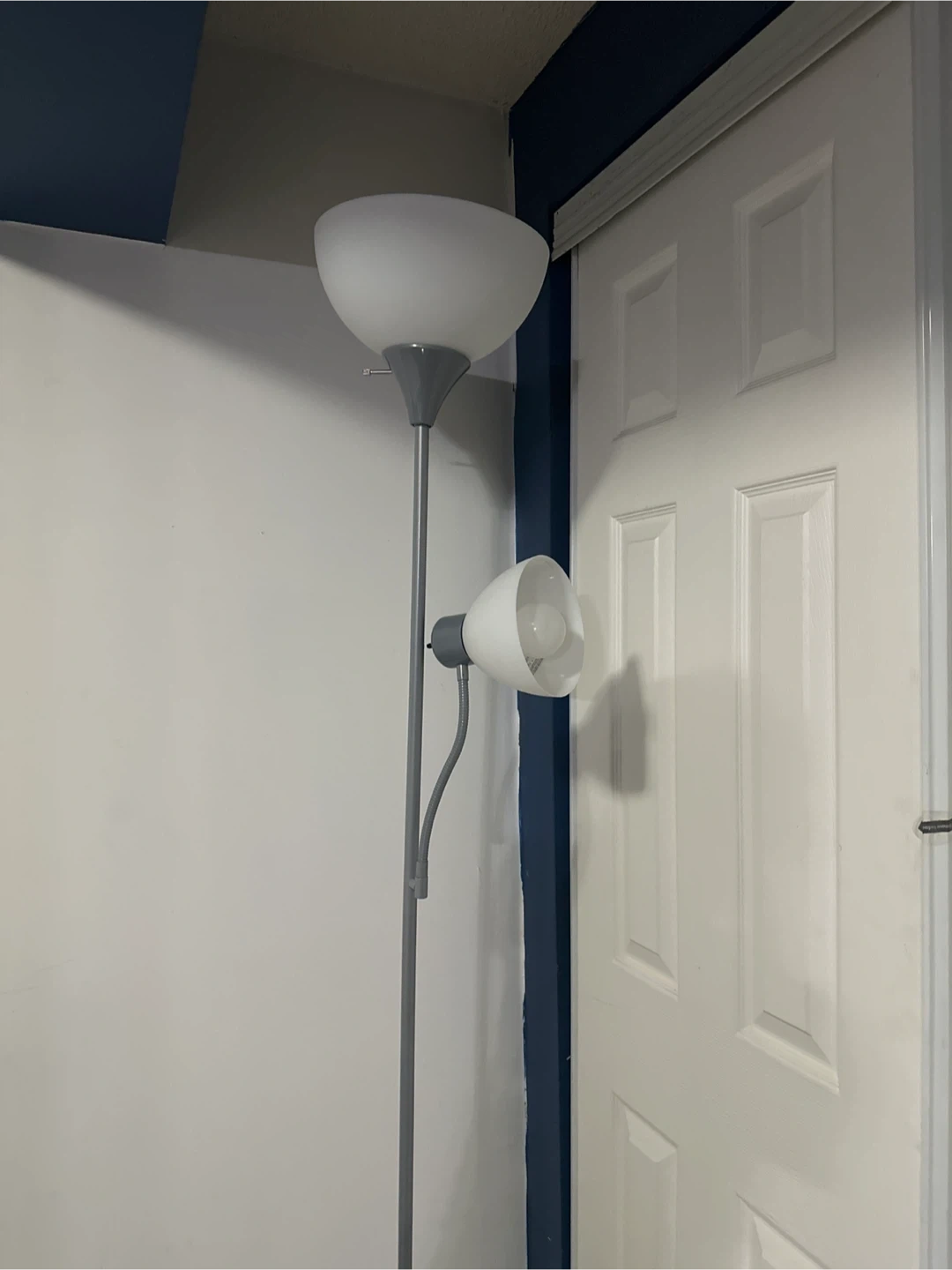 Selling a floor lamp with an adjustable reading light! It's in great condition and perfect for adding some extra light to any room. The lamp features a sleek, modern design with a grey finish that will complement any decor. It also has a convenient reading light that can be adjusted to direct light where you need it most. Great for reading or studying!
