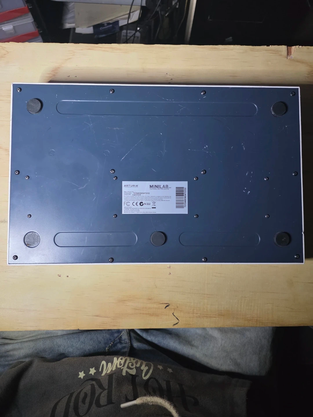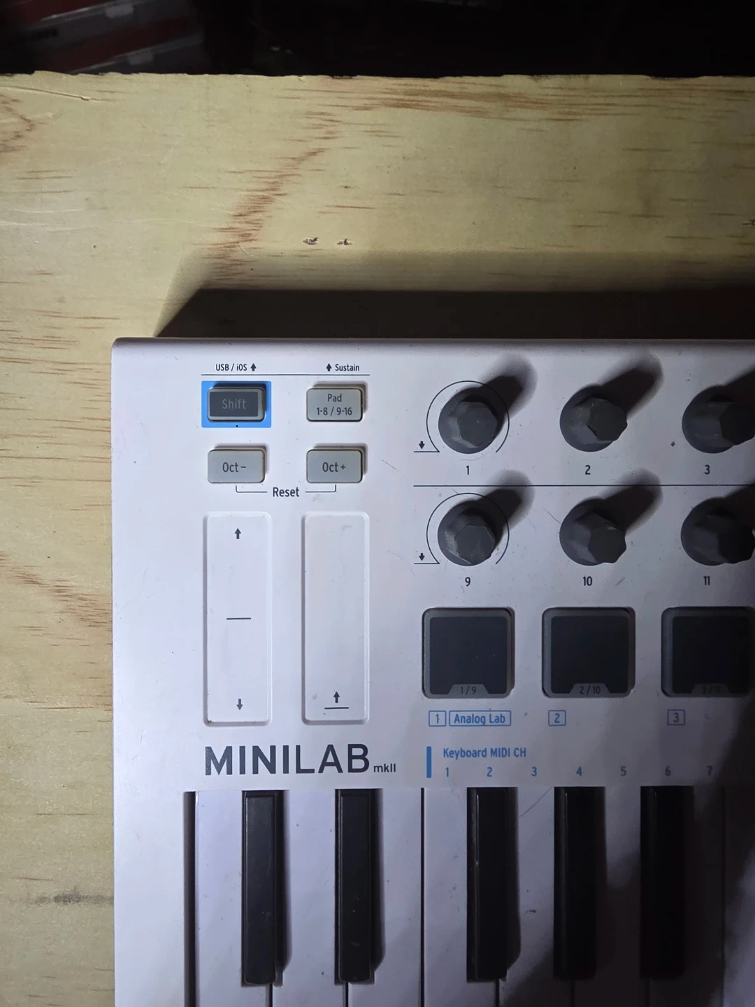 This is the Arturia Minilab MkII MIDI keyboard controller. It's a compact keyboard with 25 velocity-sensitive mini-keys. Features 8 performance pads and 16 rotary knobs. Includes USB and sustain pedal inputs.