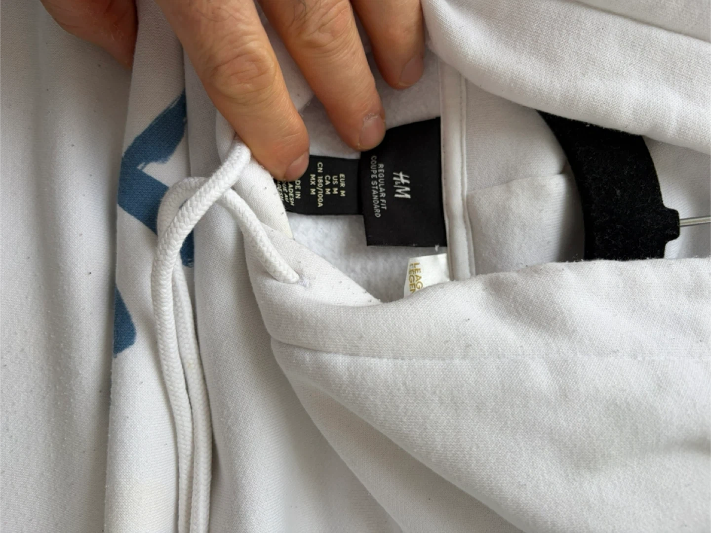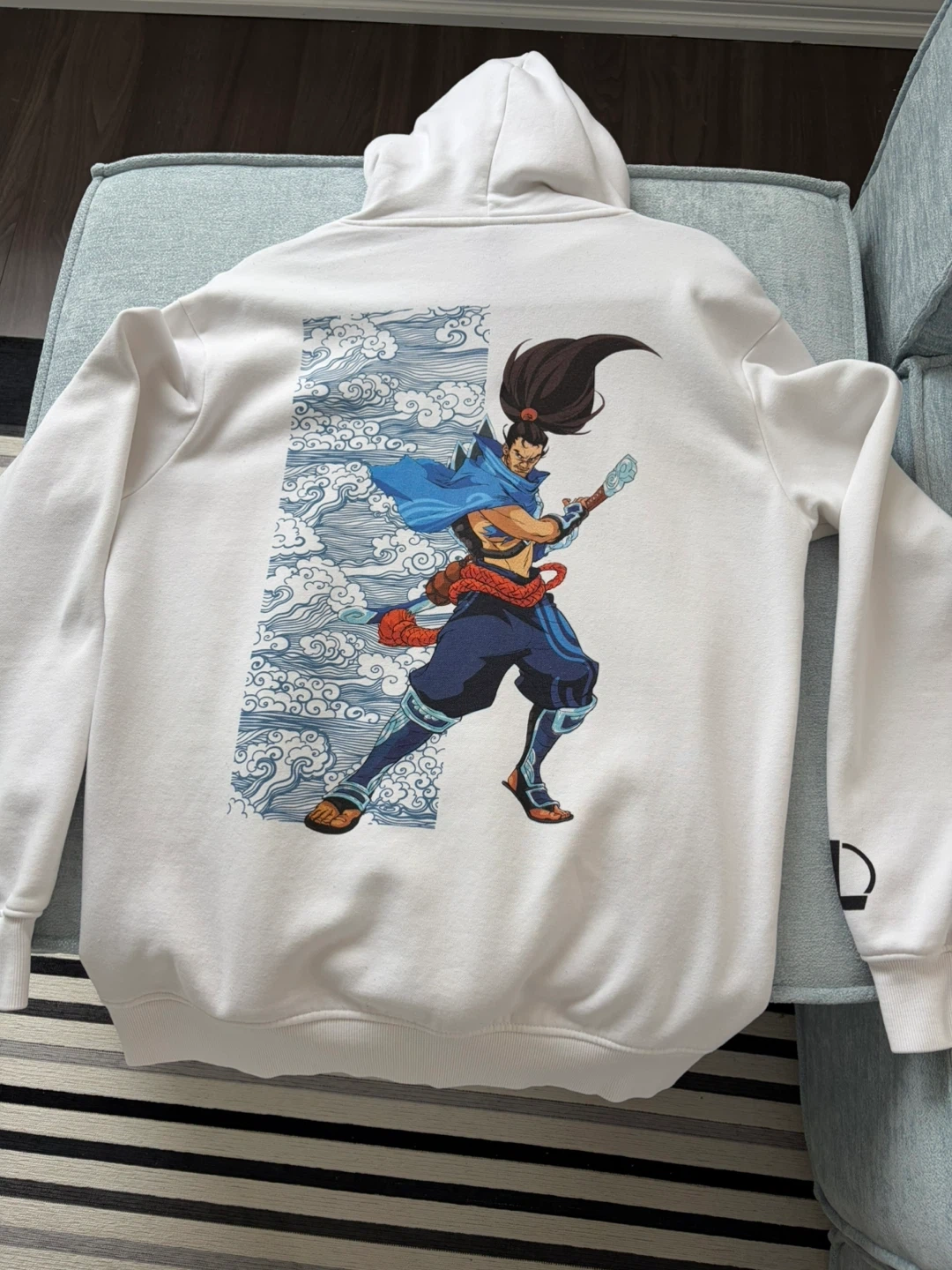 White H&M hoodie featuring artwork of Yasuo from League of Legends. It's a size medium. Made from a comfortable cotton blend.