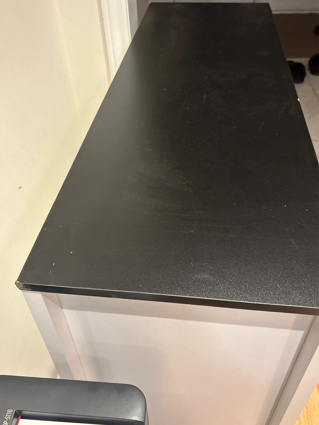 White buffet with black top and dark hardware. Two drawers and four cabinet doors for storage. This piece offers ample space for dining essentials or decor. Great for a dining room or living area! This sideboard features a classic country style and a minimalist look. The 47.2" wide counter offers you plenty of space to store dishes and tablecloths as well as to place decorative objects. 2 large drawers and a 4-door cabinet offer large storage space, ideal for storing plates and utensils