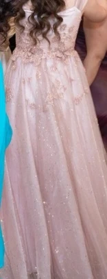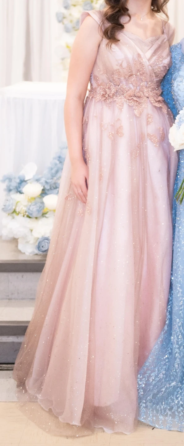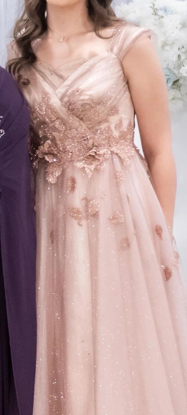 This stunning pink tulle evening dress features a sparkling glitter overlay and intricate rose gold floral appliqué detailing along the bodice and waist. It has a flattering V-neckline and cap sleeves, with a full, flow. The dress is perfect for wedding and graduation events. This dress was worn 1 time, perfect condition.