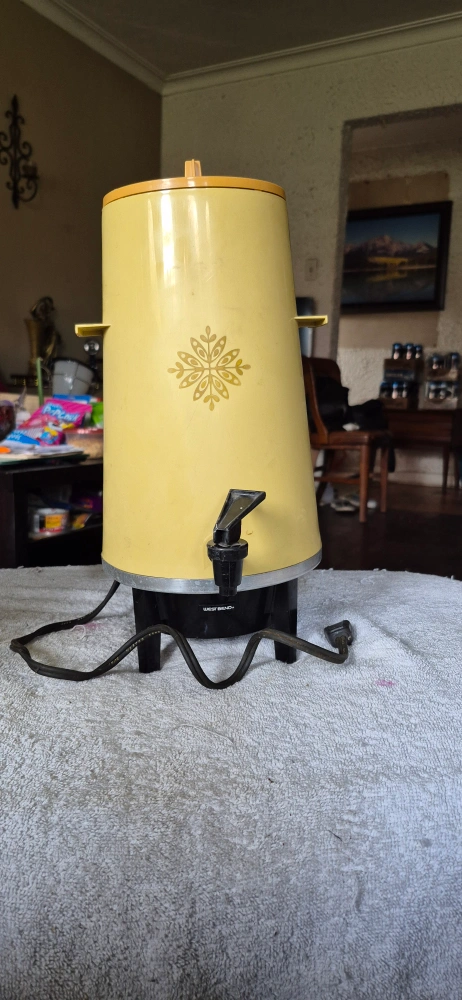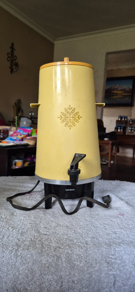 Selling a vintage West Bend coffee percolator. It's in good working condition and has a unique yellow colour, retro design Perfect for adding a touch of nostalgia to your kitchen. ready for brewing a large batch of coffee!